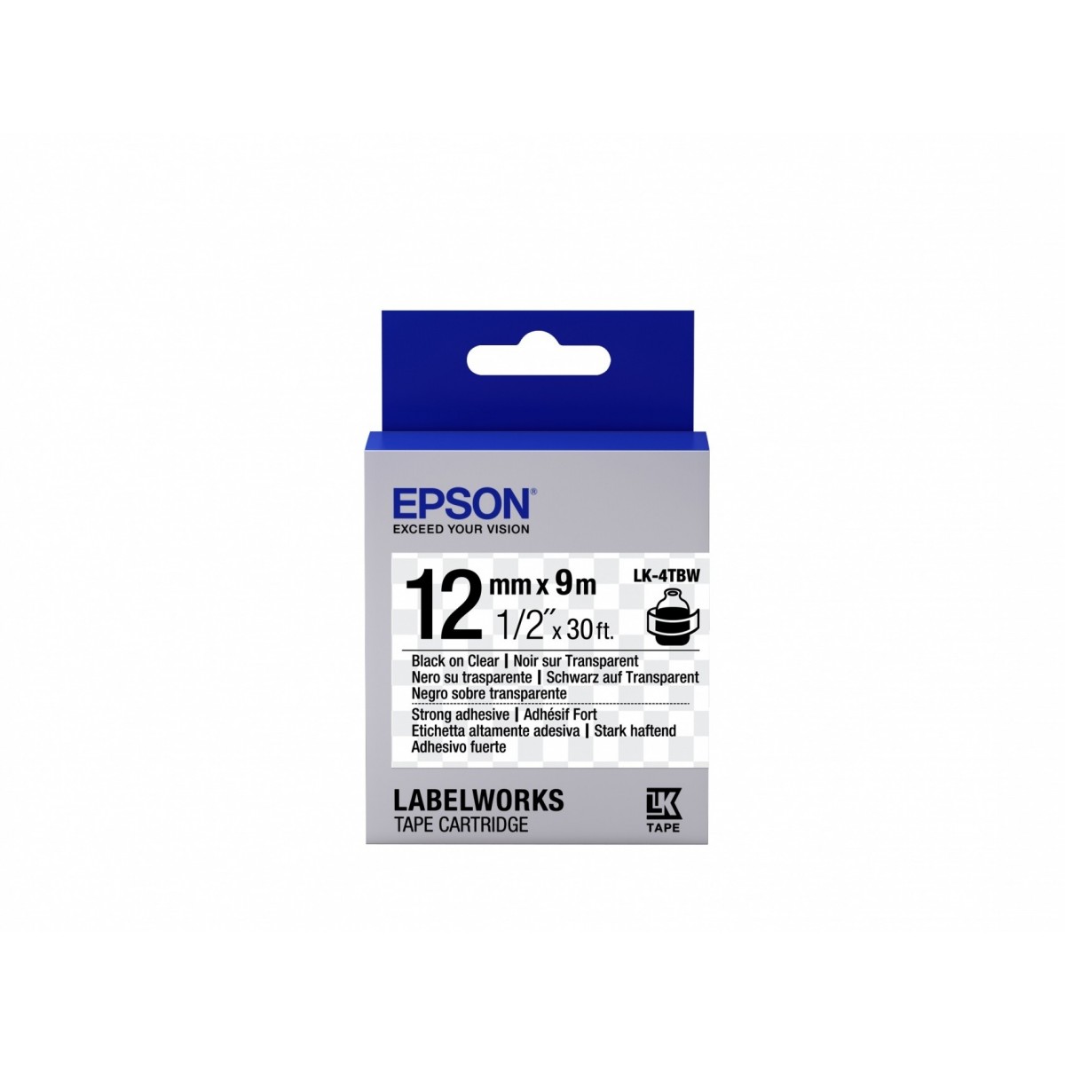 Epson Nastro fondo Trasparente per testo Nero, altamente adesivo 12/9 LK-4TBW. Colore etichetta: Nero trasparente, Paese di origine: Giappone, Compatibilità: LabelWorks LW-1000P LabelWorks LW-300 LabelWorks LW-400 LabelWorks LW-400VP LabelWorks LW-600P.... Ampiezza nastro: 1,2 cm, Lunghezza nastro: 9 m, Quantità per pacco: 1 pezzo(i). Ampiezza del pallet: 80 cm, Lunghezza del pallet: 120 cm, Altezza del pallet: 64 cm