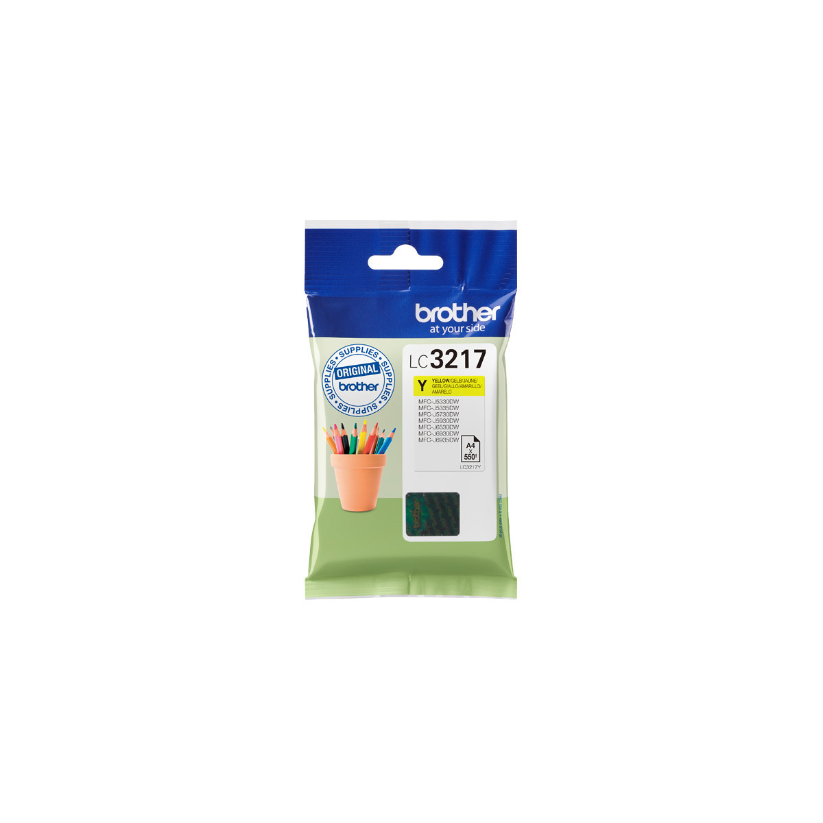 Brother LC-3217Y. Tipo: Originale, Tipo di inchiostro: Inchiostro a base di pigmento, Colori di stampa: Giallo. Tipo di imballo: Blister