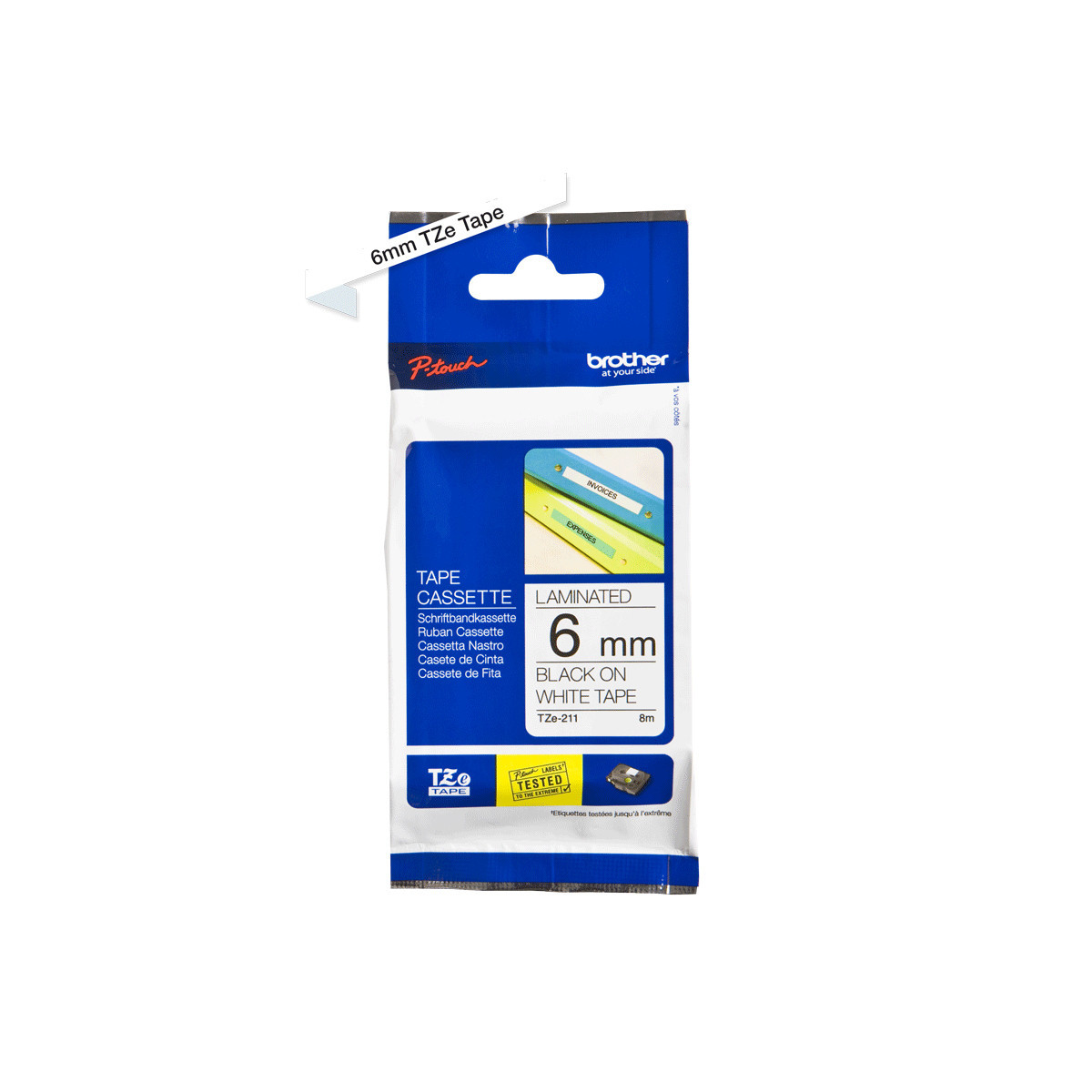 Brother TZe211. Colore etichetta: Nero su bianco, Tipo nastro: TZe, Colore del prodotto: Grigio. Ampiezza nastro: 6 mm, Lunghezza nastro: 8 m, Tipo di imballo: Blister