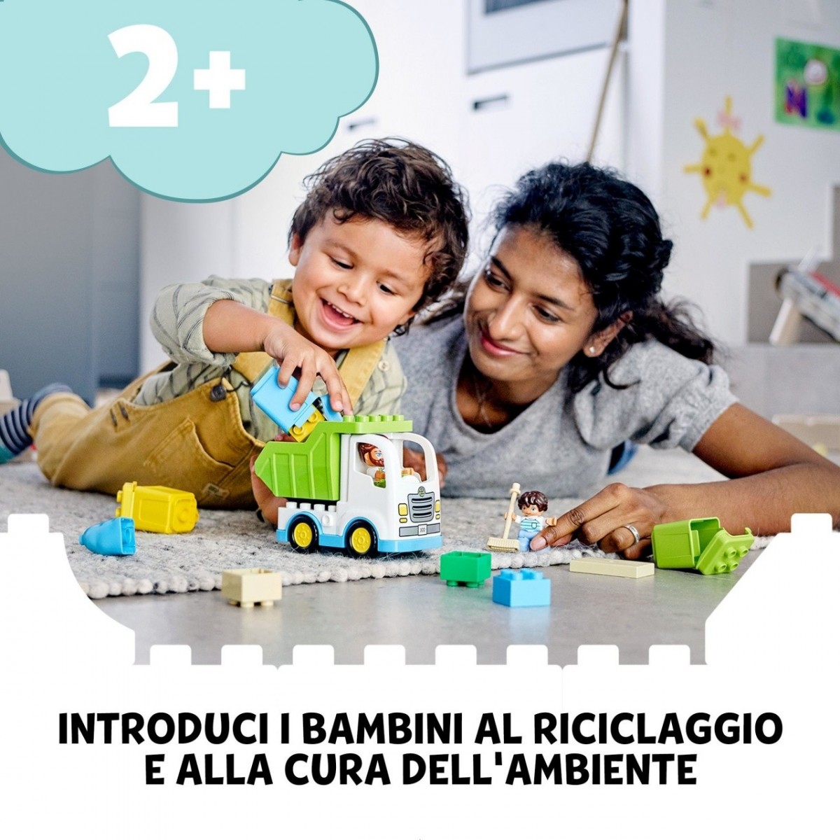 C'è così tanto da fare e imparare con questo gioco educativo per bambini. Mentre aiutano le 2 minifigure DUPLO in una serie di attività di riciclaggio, i bambini possono esercitarsi a ordinare i colori mettendo i sacchi colorati nei bidoni corrispondenti; sviluppare capacità motorie complesse con i coperchi dei bidoni apri-e-chiudi e alla guida del camion della spazzatura giocattolo; liberare l’immaginazione con giochi di ruolo dalle storie infinite; spazzare via i rifiuti rovesciati con la scopa grande e sviluppare abitudini ecologiche utili per tutta la vita.