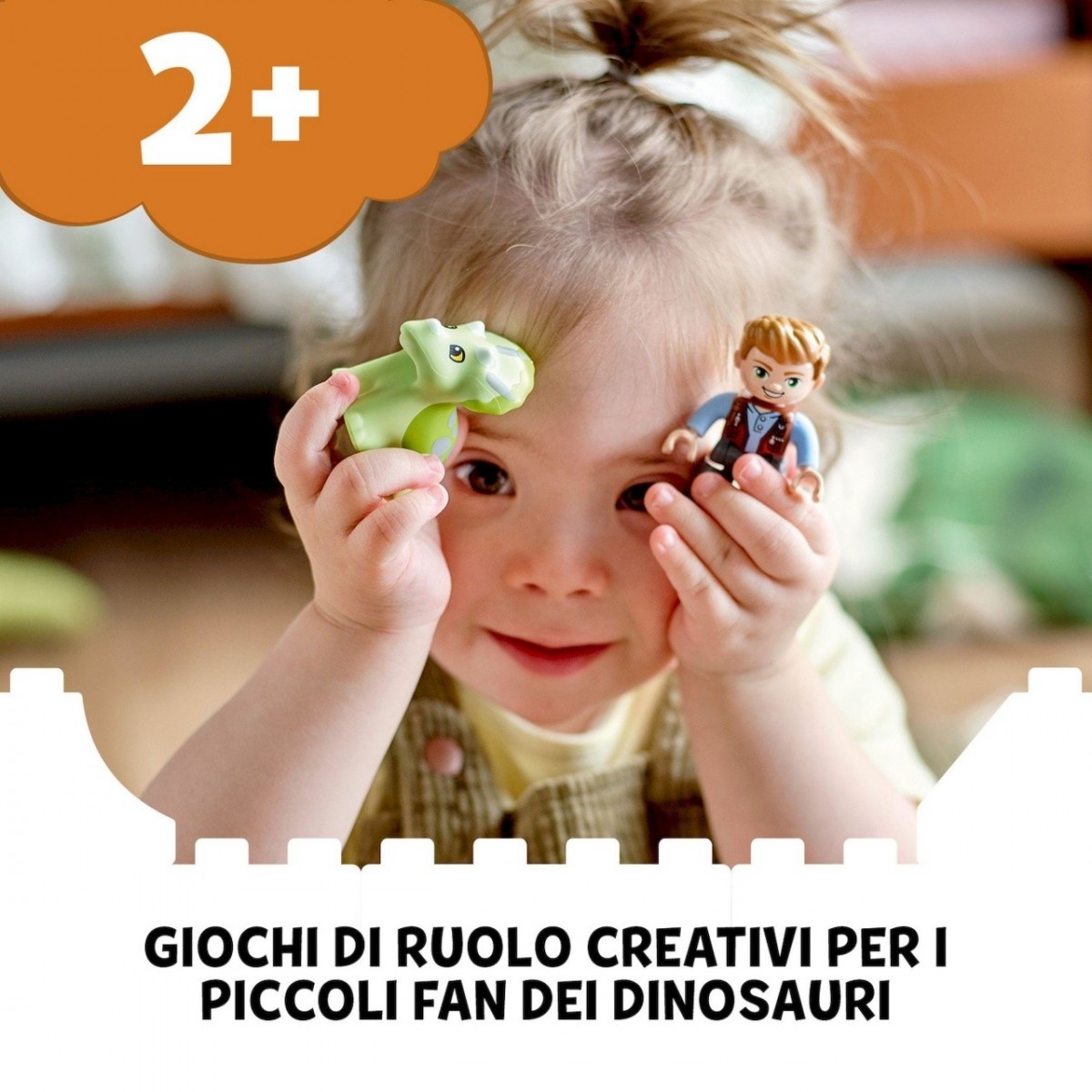 Questo set LEGO DUPLO Jurassic World Fuga del T. rex e del Triceratopo (10939) è un giocattolo ideale per bambini e bambine dai 2 anni in su ed è ricco di funzioni divertenti e dell'azione cinematografica Jurassic World, che faranno ruggire di gioia i bambini amanti dei dinosauri.