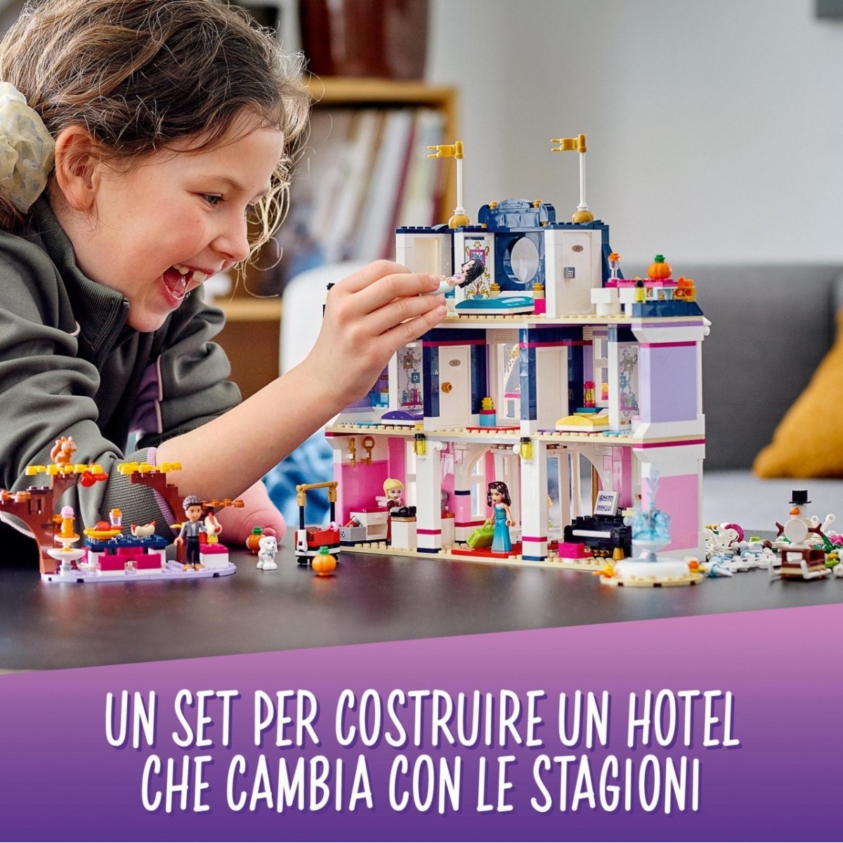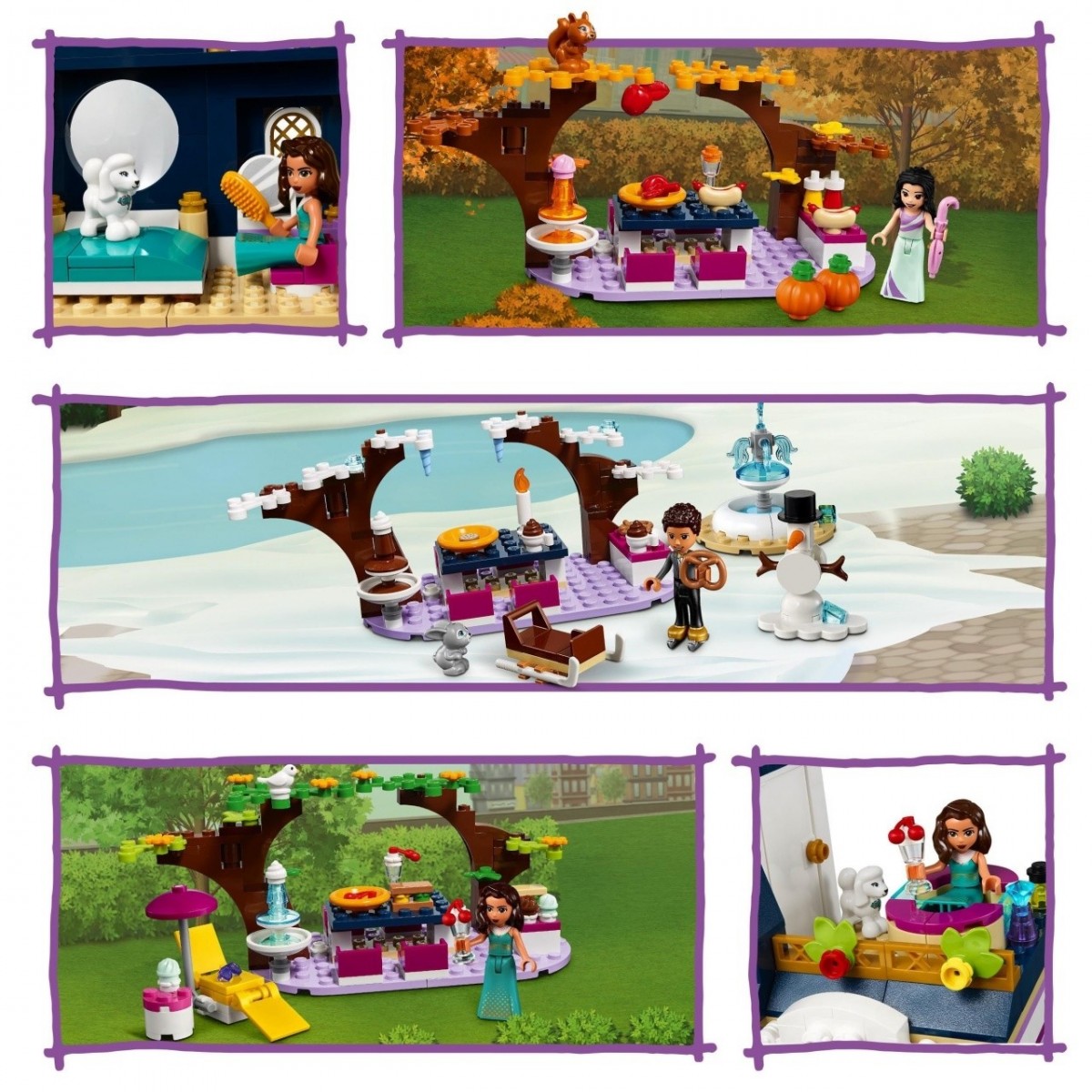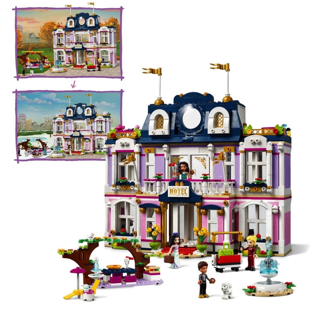 Gli accessori stagionali inclusi donano una dimensione aggiuntiva al gioco. Il tempo passa e i bambini decorano in maniera nuova e creativa l'hotel per restare al passo con le stagioni. Le foglie degli alberi possono cambiare colore in autunno, ci sono palle di neve, ghiaccioli e un pupazzo di neve per l'inverno e fiori per l'estate.