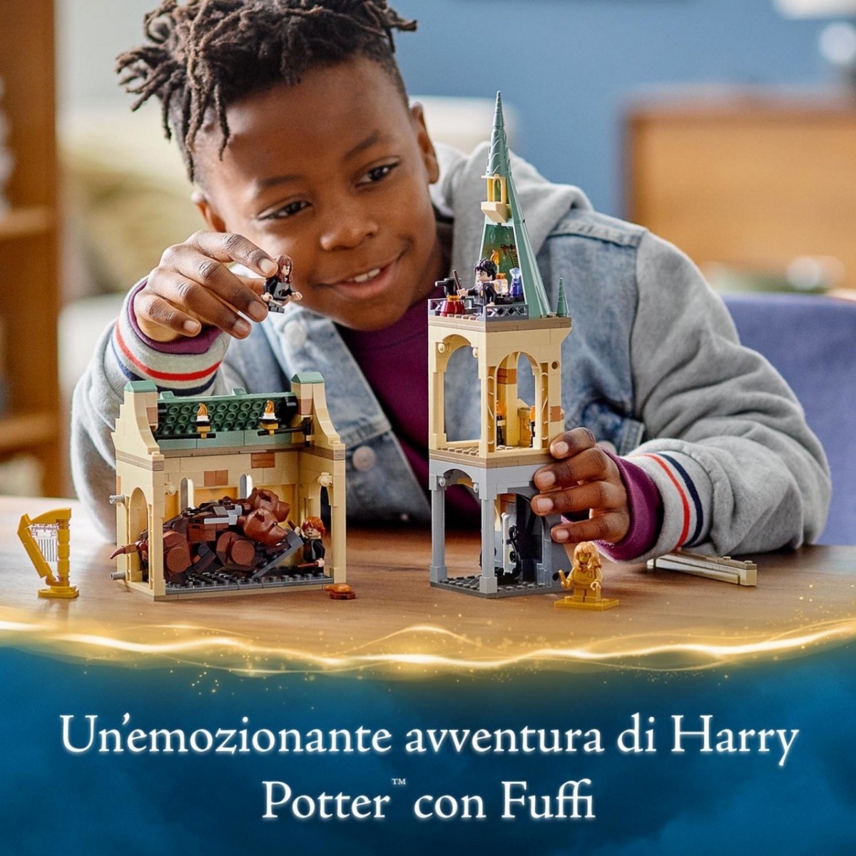 La magia non finisce qui! Questo playset contiene anche le 3 minifigure di Harry Potter, Ron Weasley and Hermione Granger; un’esclusiva minifigure di Hermione Granger d’oro per celebrare i 20 anni di magia con LEGO Harry Potter; 2 tessere a sorpresa delle carte dei maghi e la possibilità di aggiungere altre stanze per creare un intero modello del Castello di Hogwarts.