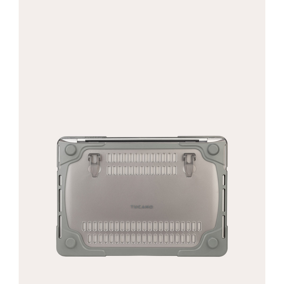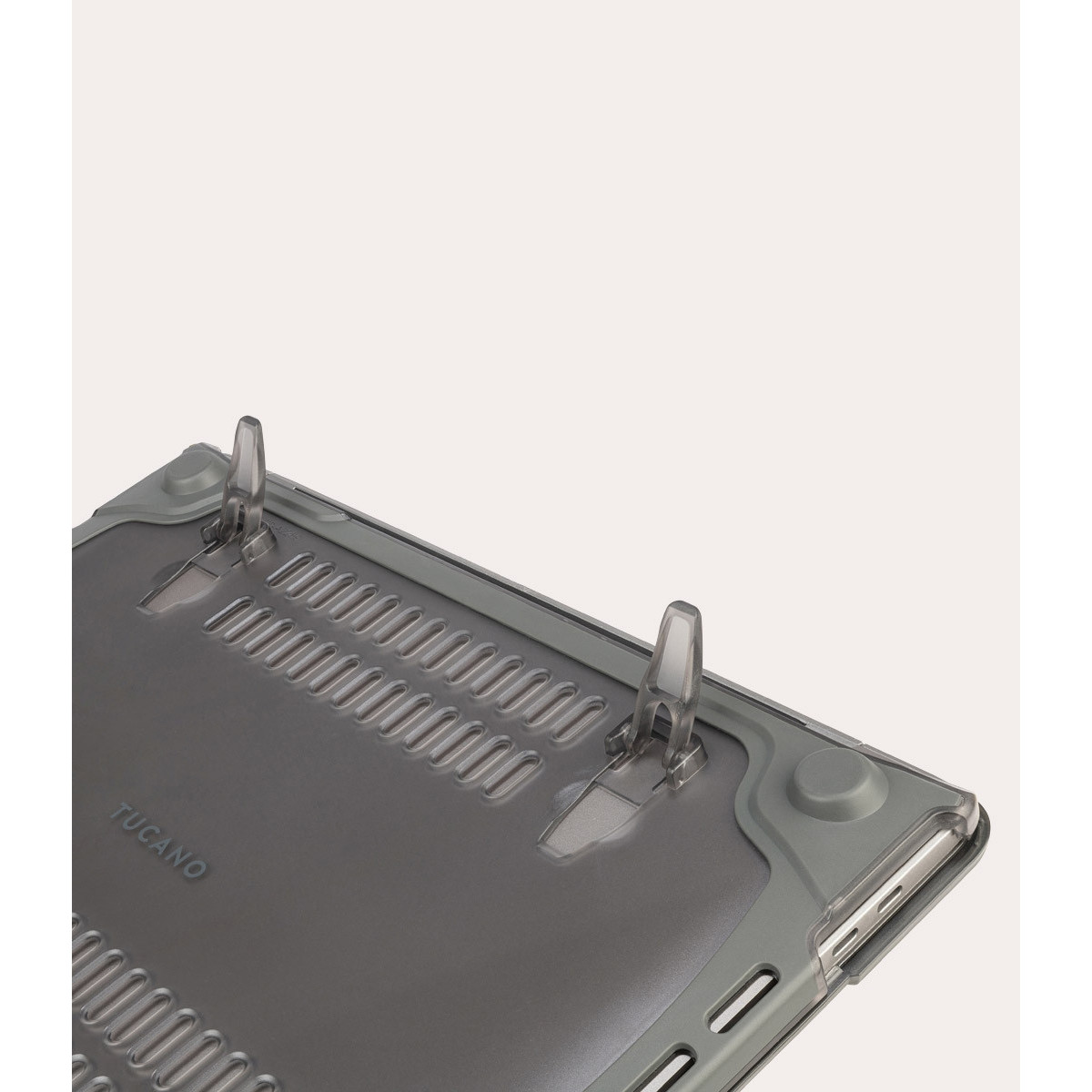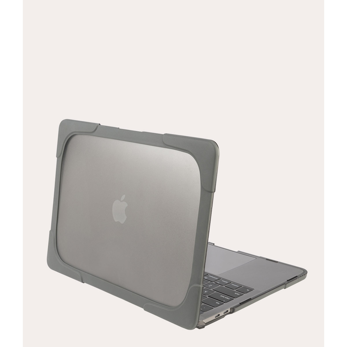 Custodia rigida e super protettiva per MacBook Pro 13" dotata di scocca anteriore e posteriore con costruzione perimetrale anti-shock in TPU e ampia sezione centrale in policarbonato trasparente. I due mini standup a scomparsa, permettono di lavorare con il laptop inclinato favorendo una buona postura. Le fessure e i piedini, presenti sulla scocca posteriore, facilitano la corretta areazione del dispositivo.