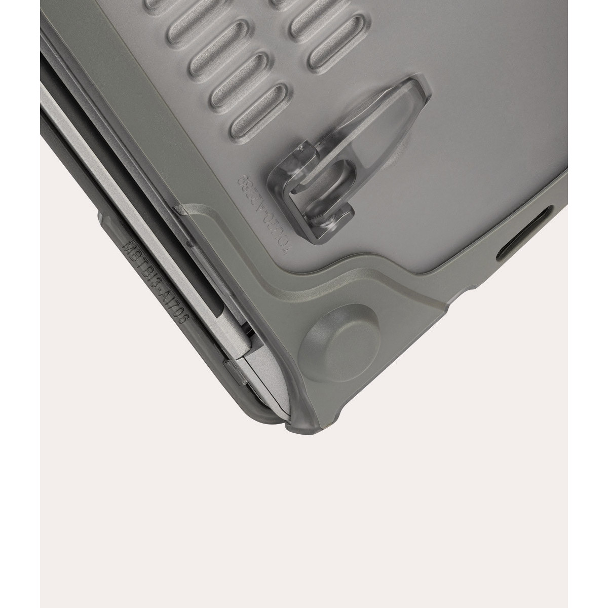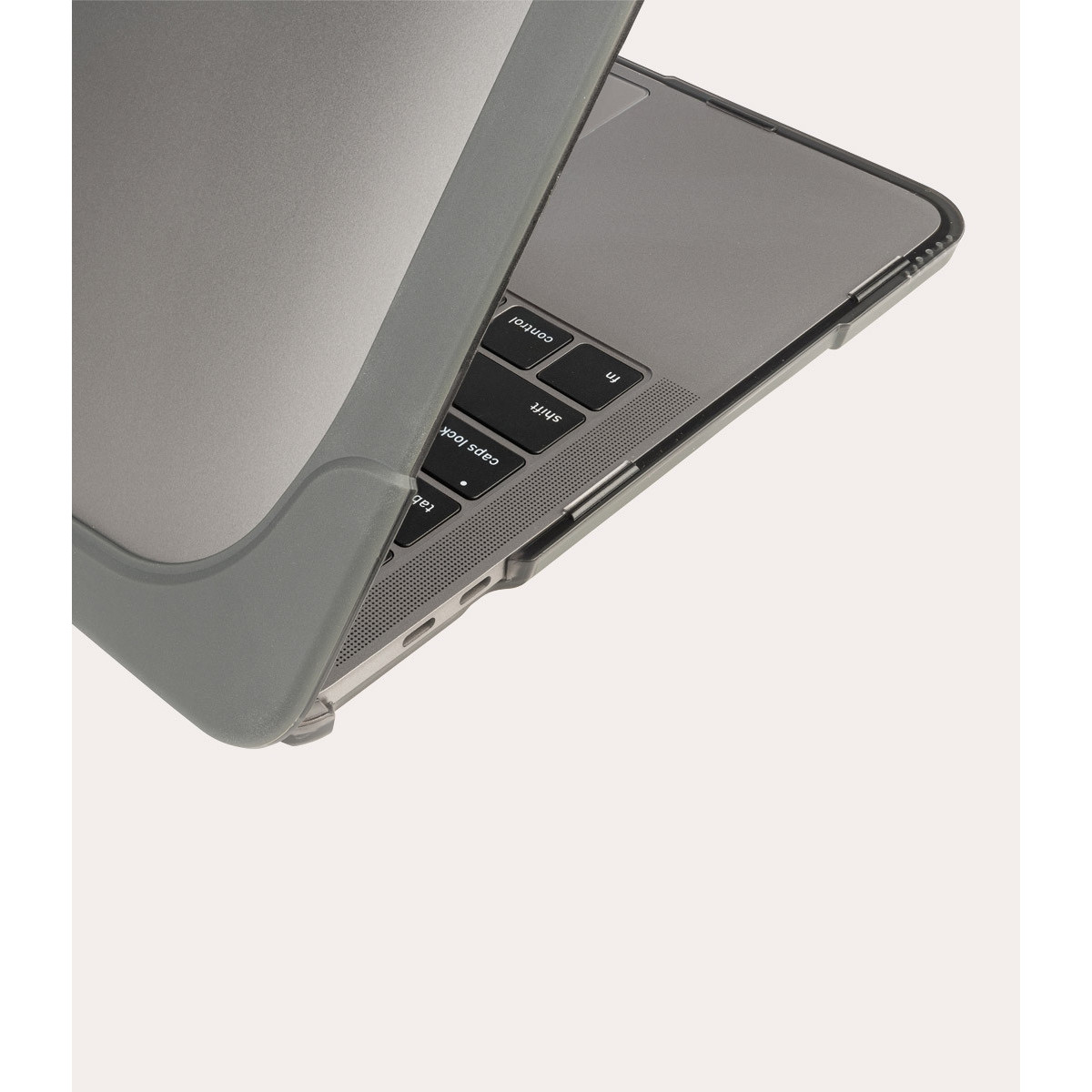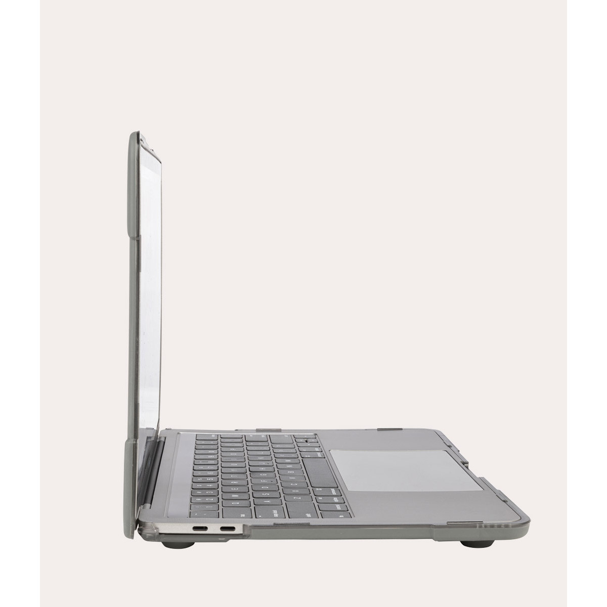 Custodia rigida e super protettiva per MacBook Pro 13" dotata di scocca anteriore e posteriore con costruzione perimetrale anti-shock in TPU e ampia sezione centrale in policarbonato trasparente. I due mini standup a scomparsa, permettono di lavorare con il laptop inclinato favorendo una buona postura. Le fessure e i piedini, presenti sulla scocca posteriore, facilitano la corretta areazione del dispositivo.