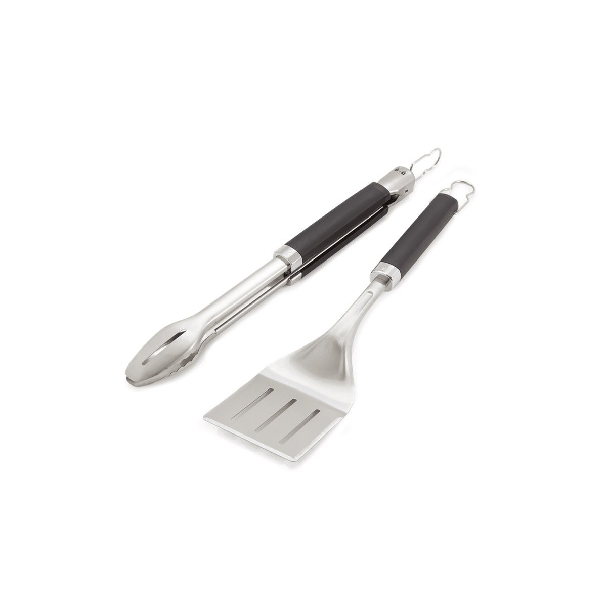Kit composto da pinza e spatola con impugnatura in gomma antiscivolo. Lavabile in lavastoviglie. Lunghezza 46 cm. Compatibile con magneti premium.