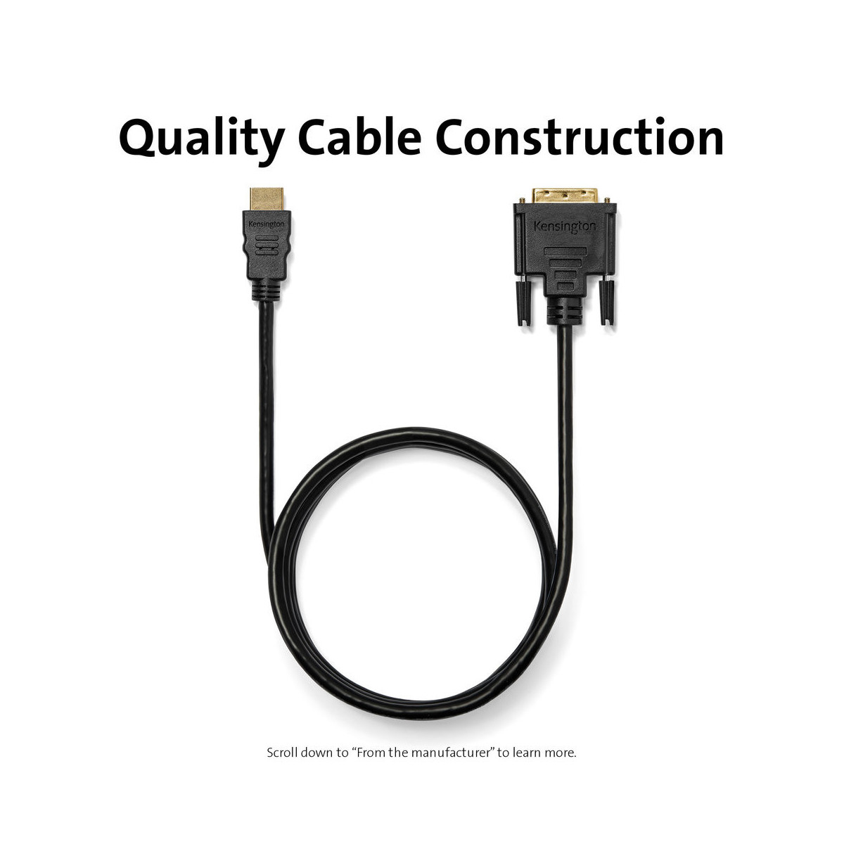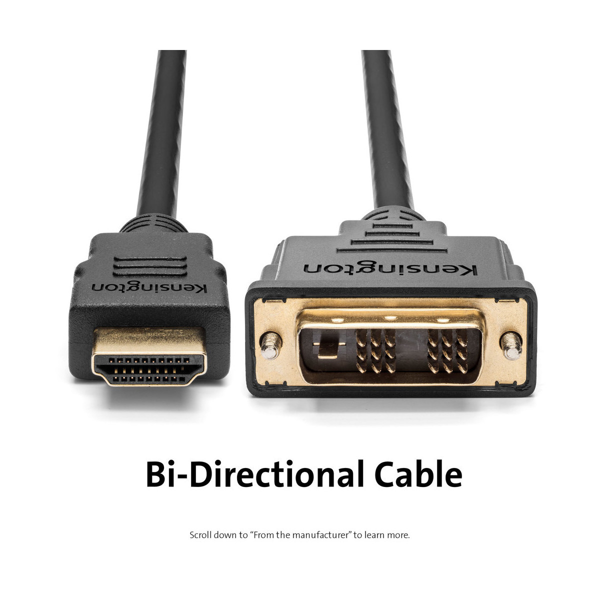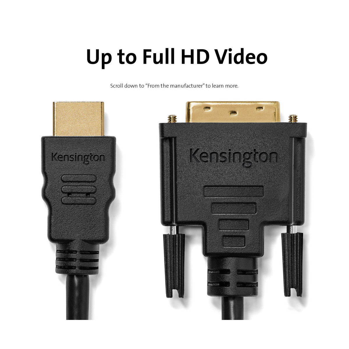 Un cavo essenziale per il collegamento di laptop e PC desktop con HDMI o DVI a monitor con un altro tipo di attacco, il cavo passivo Kensington da HDMI (M) a DVI-D (M) offre connettività affidabile per monitor e console multimediali, compresi lettori di Blu-ray, Apple TV, Roku, Play Station 3/4, Xbox One/360 o Nintendo Wii. Questo cavo di qualità è stato testato per l'utilizzo con docking station Kensington ed è supportato da una garanzia limitata a vita Kensington. La realizzazione del cavo di qualità comprende schermatura interna ed esterna per ridurre al minimo possibili interferenze radio (RFI) ed elettromagnetiche (EMI), connettori placcati in oro e viti ad alette per fornire prestazioni continue del cavo.