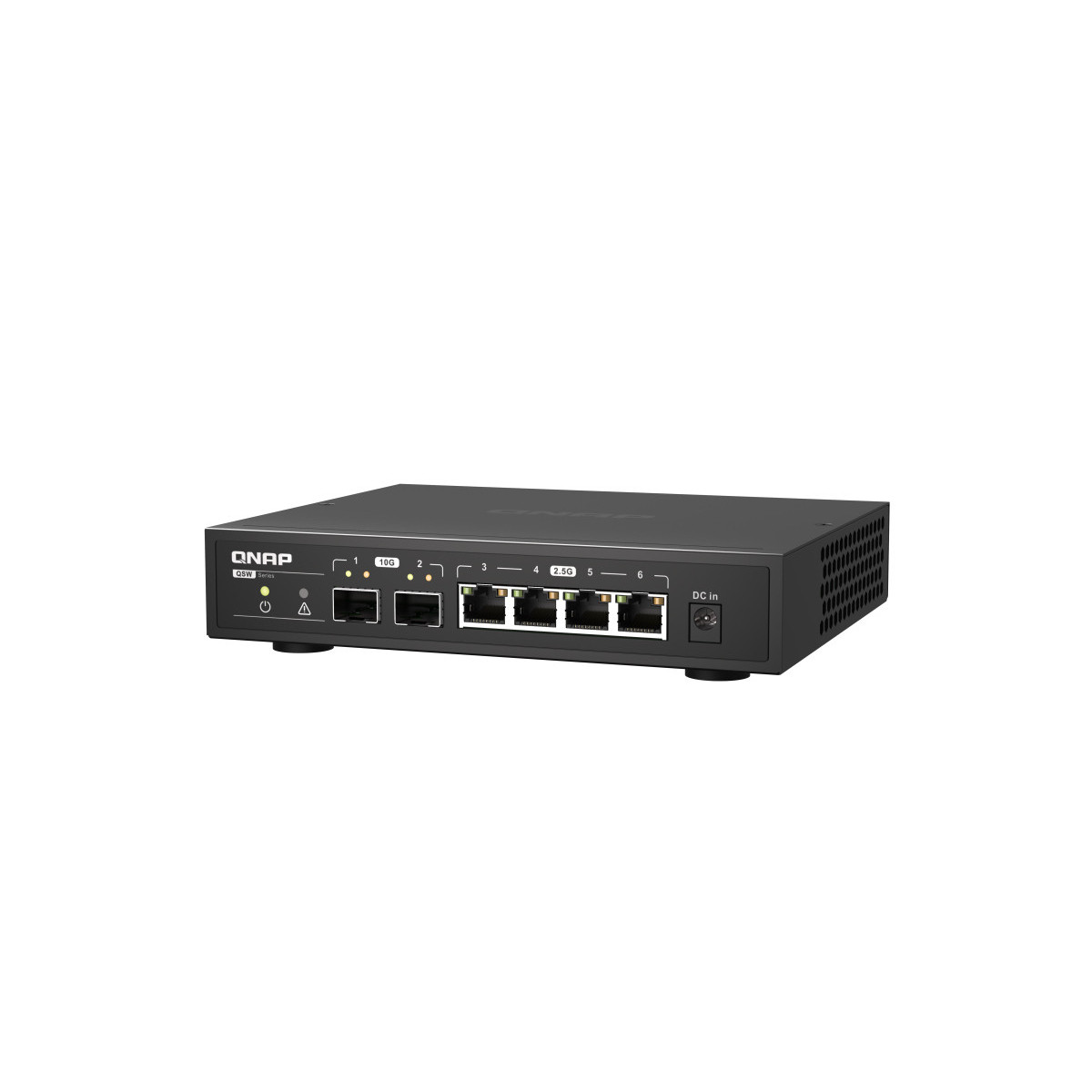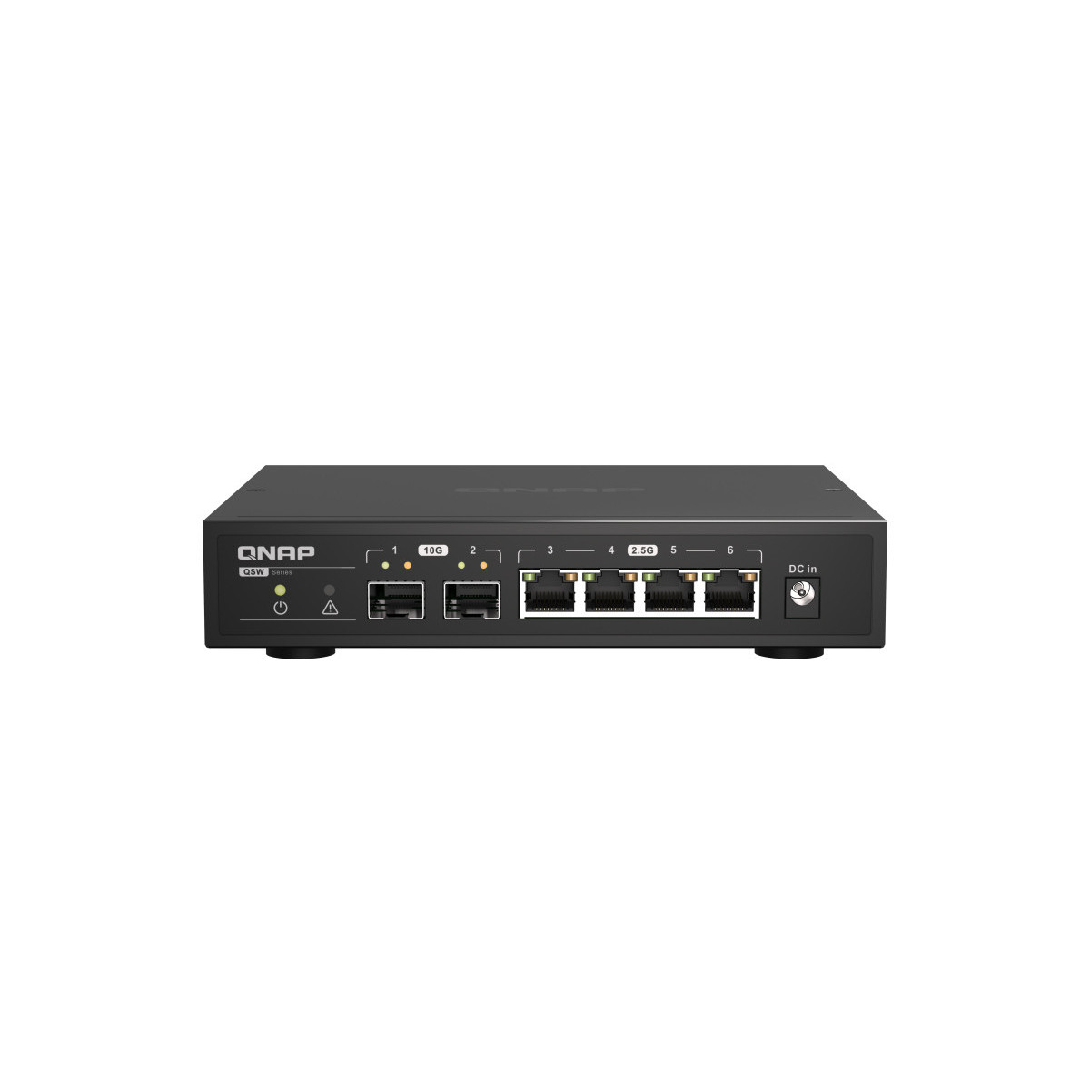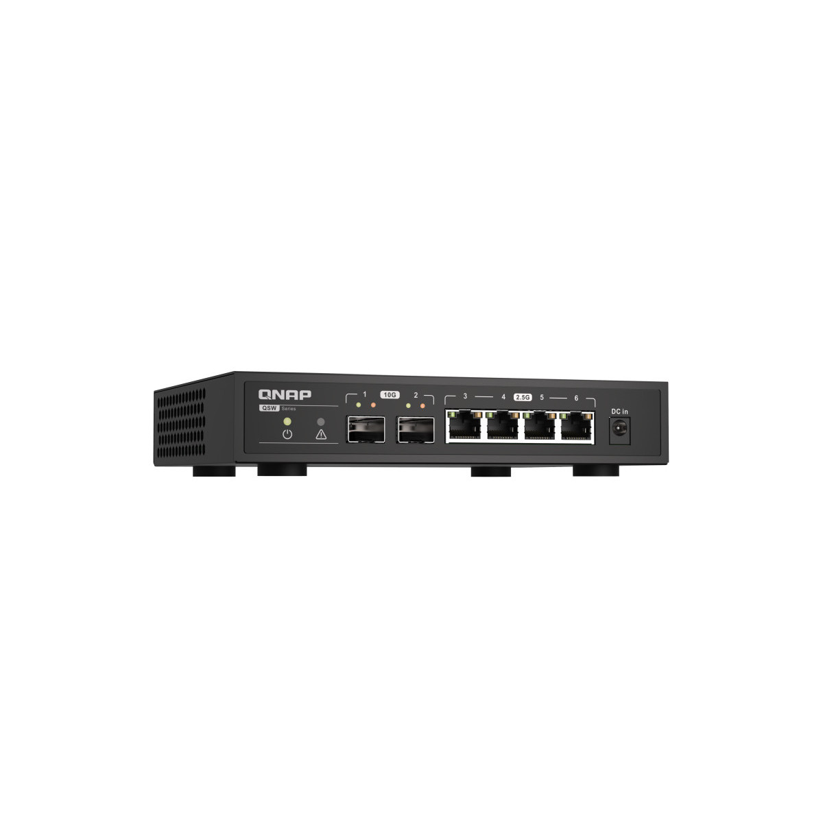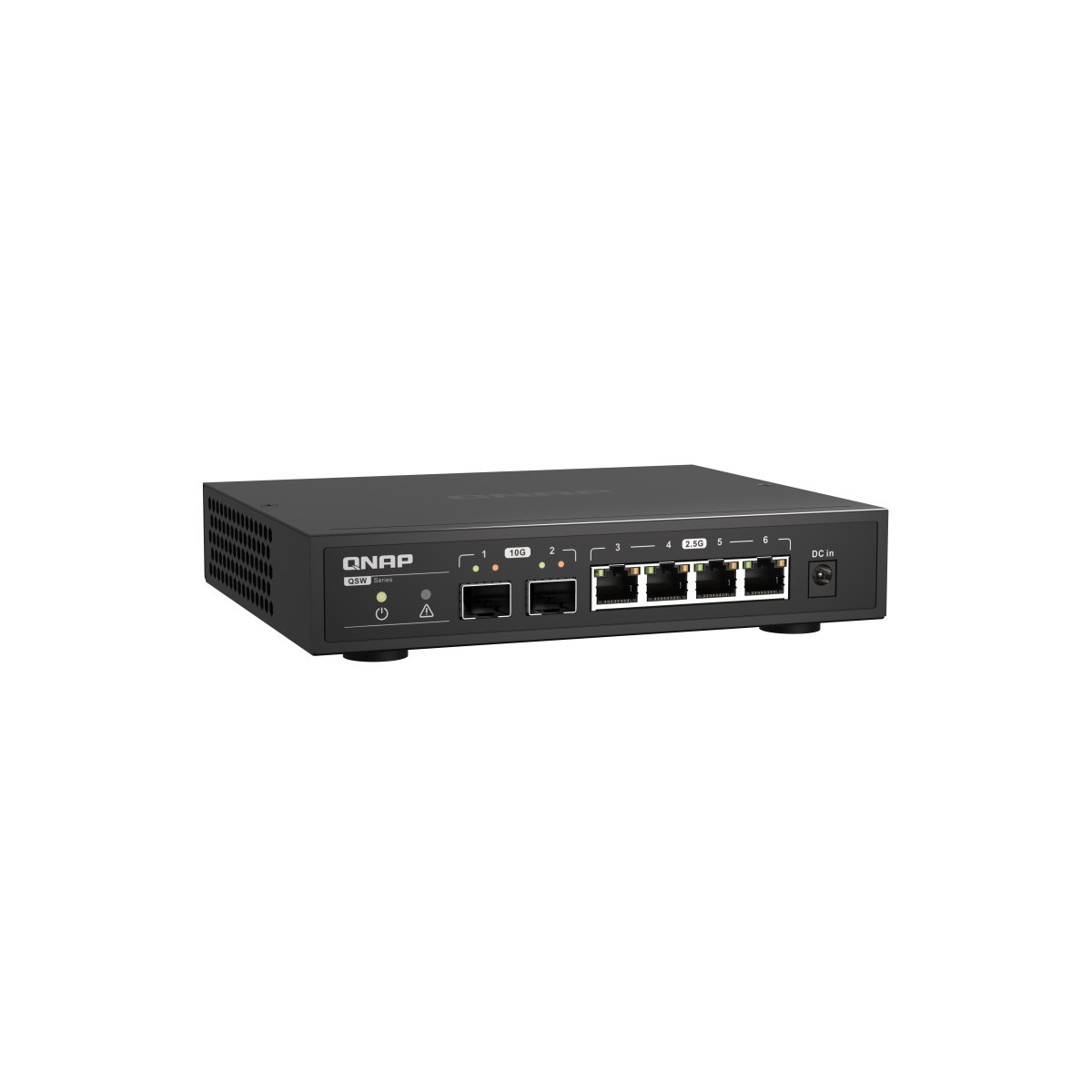 QNAP QSW-2104-2S. Tipo interruttore: Non gestito. Quantità di porte RJ-45: 4. Dimensioni tavola MAC: 16000 voci, Capacità di commutazione: 60 Gbit/s. Standard di rete: IEEE 802.3ab,IEEE 802.3az,IEEE 802.3bz,IEEE 802.3u. Voltaggio input DC: 12 V