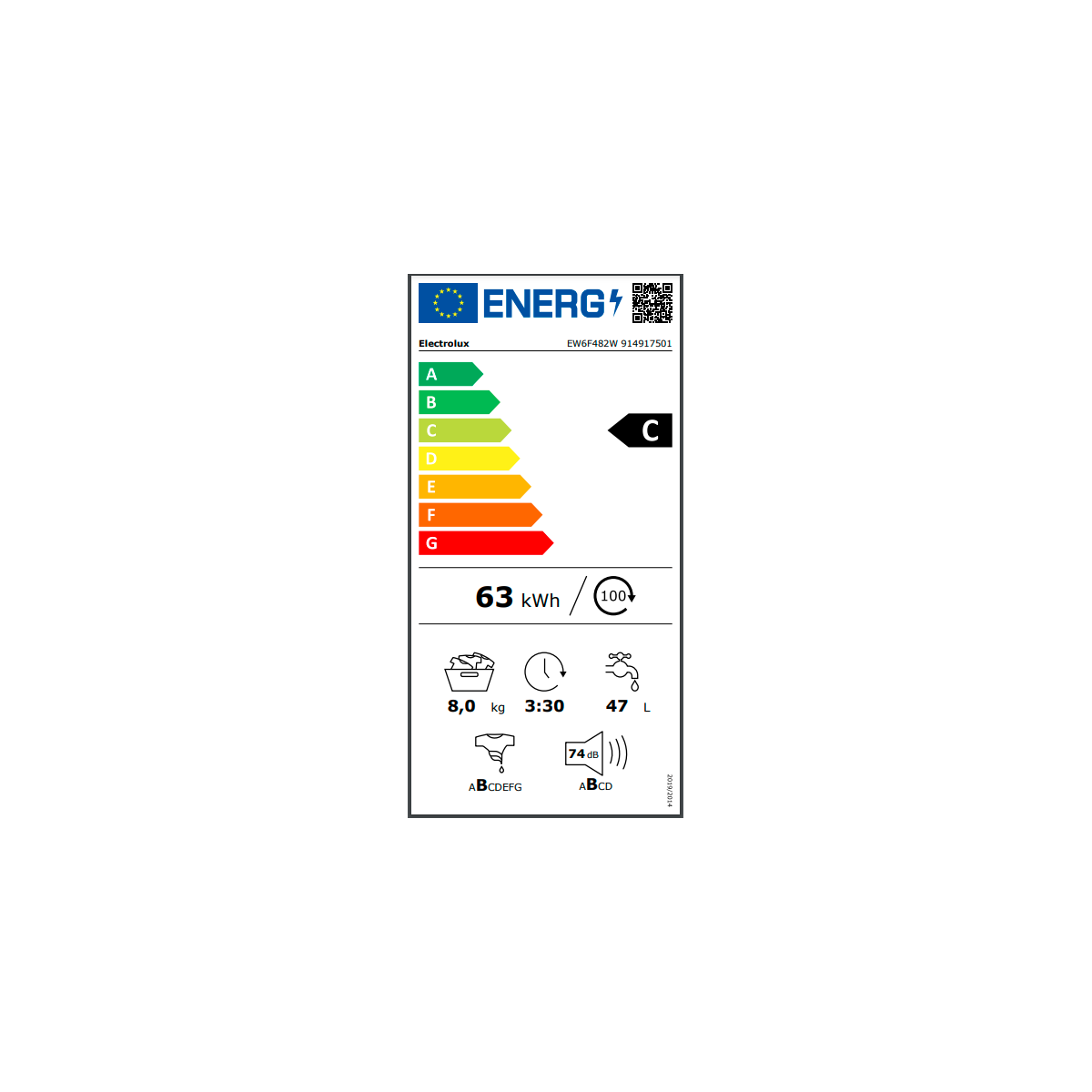 - Classe di efficienza di asciugatura con centrifuga del programma eco 40-60 (UE 2017/1369): B