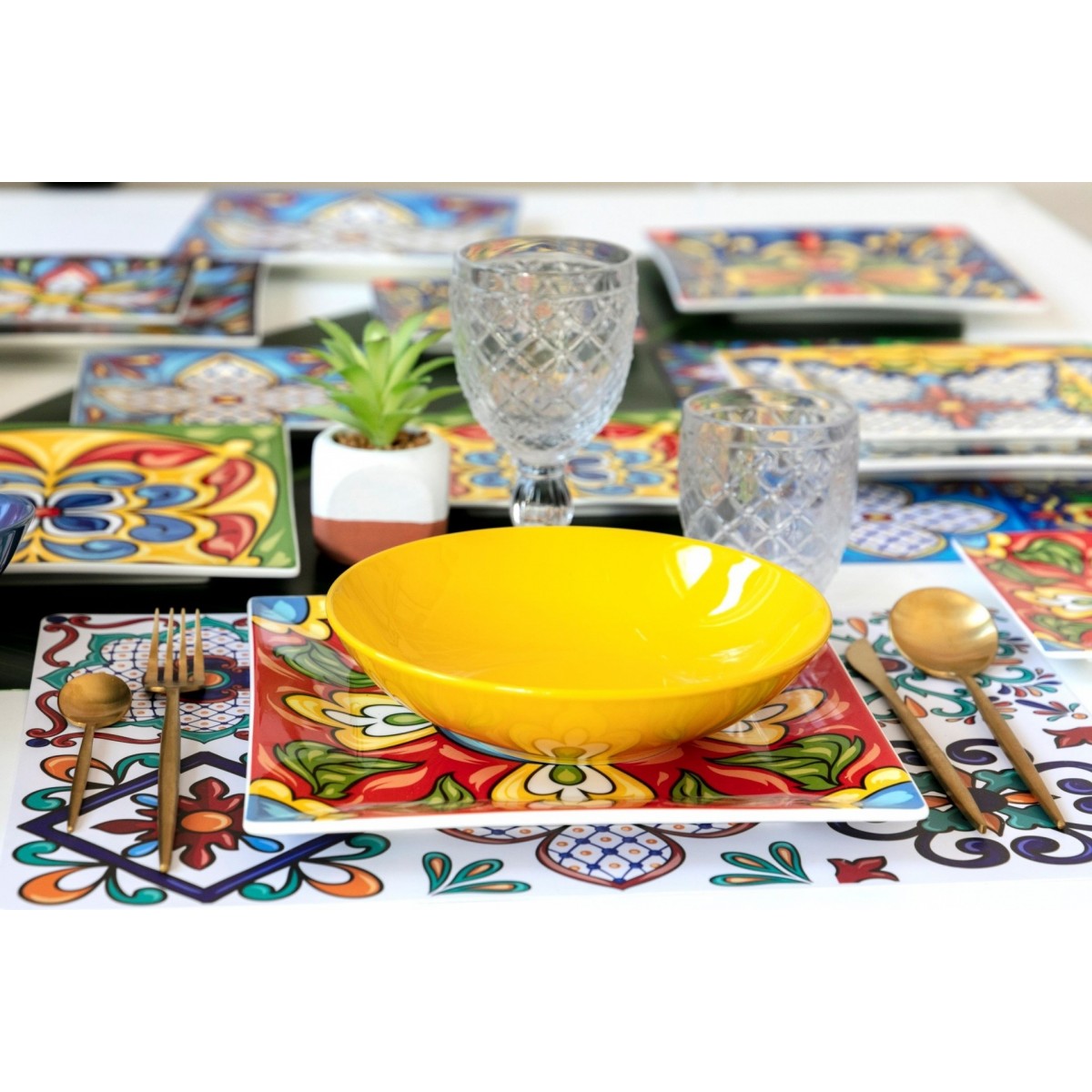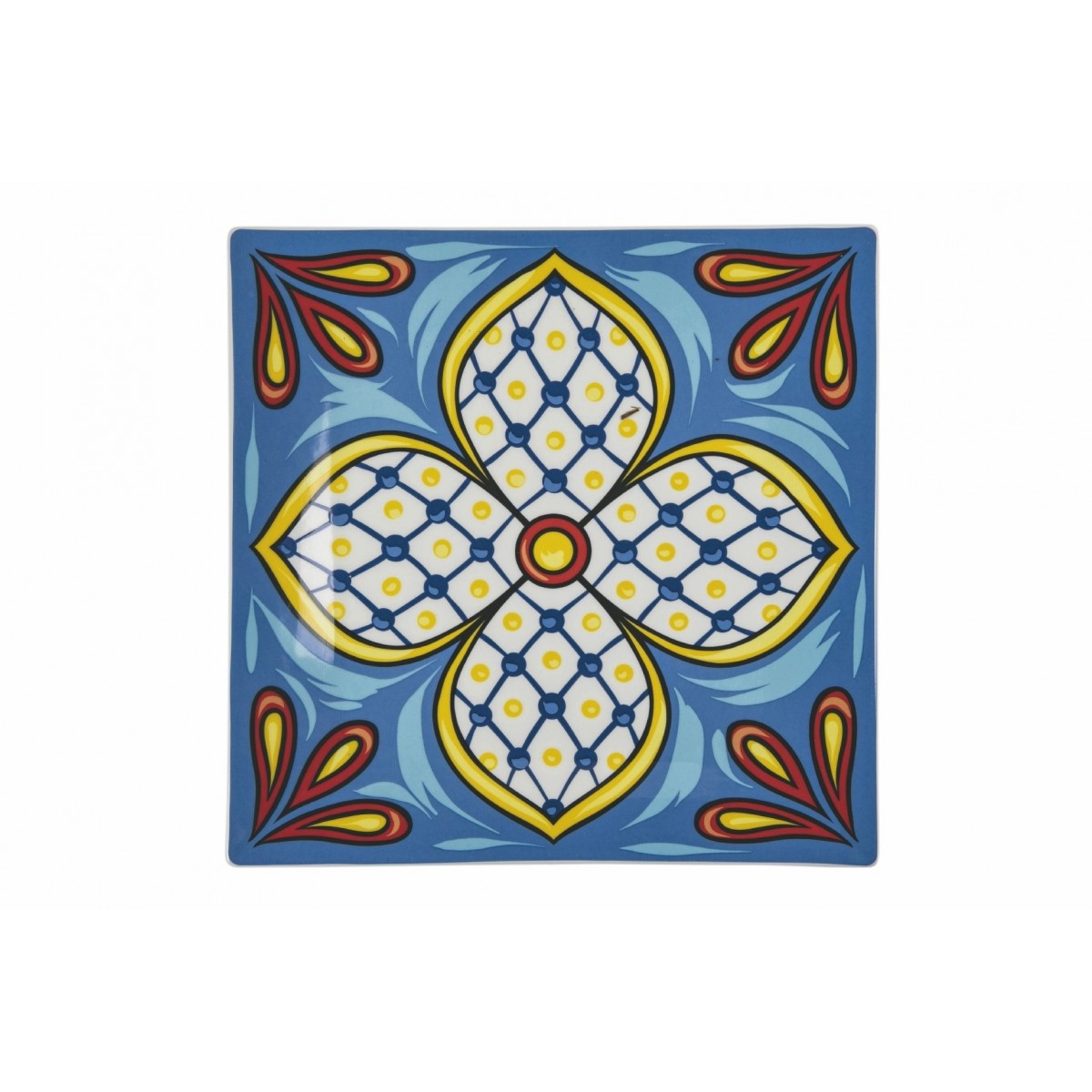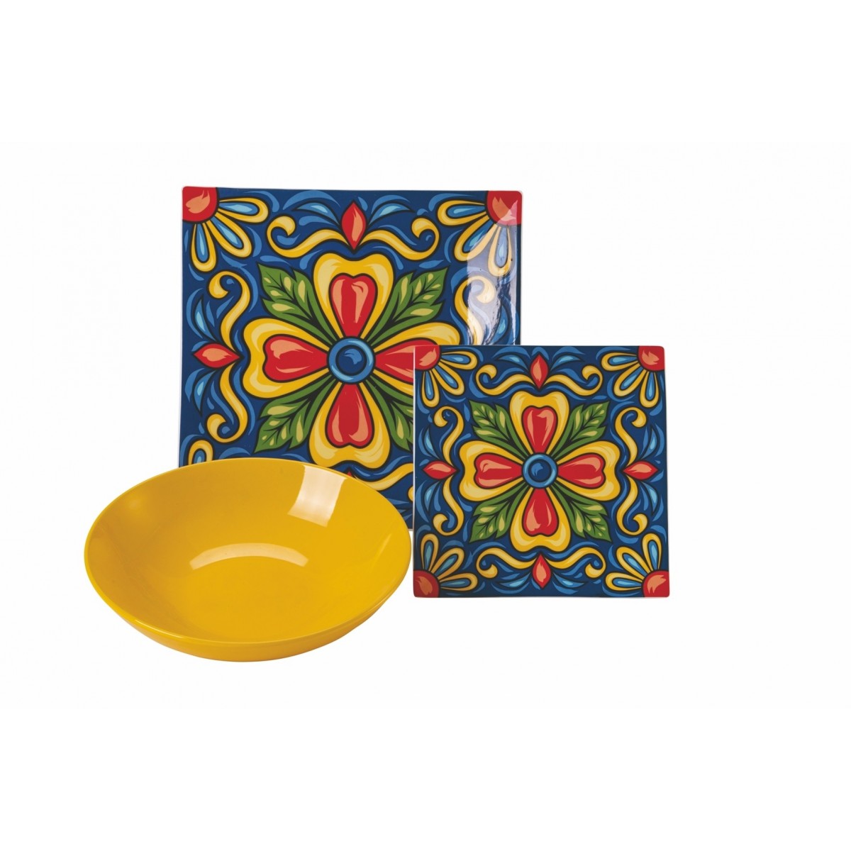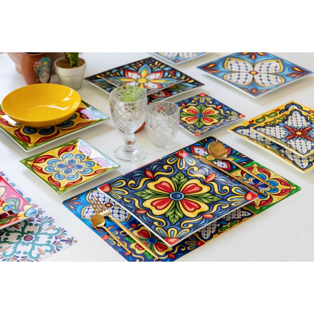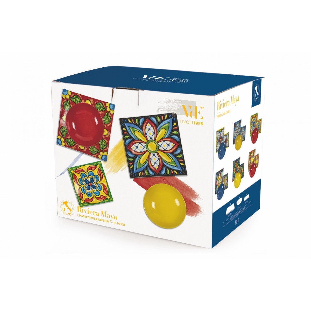 Riviera Maya Servizio tavola 18 pezzi Realizzato in porcellana e gres 6 posti tavola in 6 diversi colori nella stessa confezione Il servizio si compone di 6 piatti piani, 6 piatti fondi, 6 piatti frutta. Piatto piano quadrato: l. 25 p. 25 h. 1,5 h (peso: 1000 gr) Piatto fondo: Ø 20 x h. 5 cm (peso: 500 gr) Piatto frutta quadrato: l 17 x p. 17 x h. 1 cm (peso: 300 gr) Si consiglia lavaggio a mano