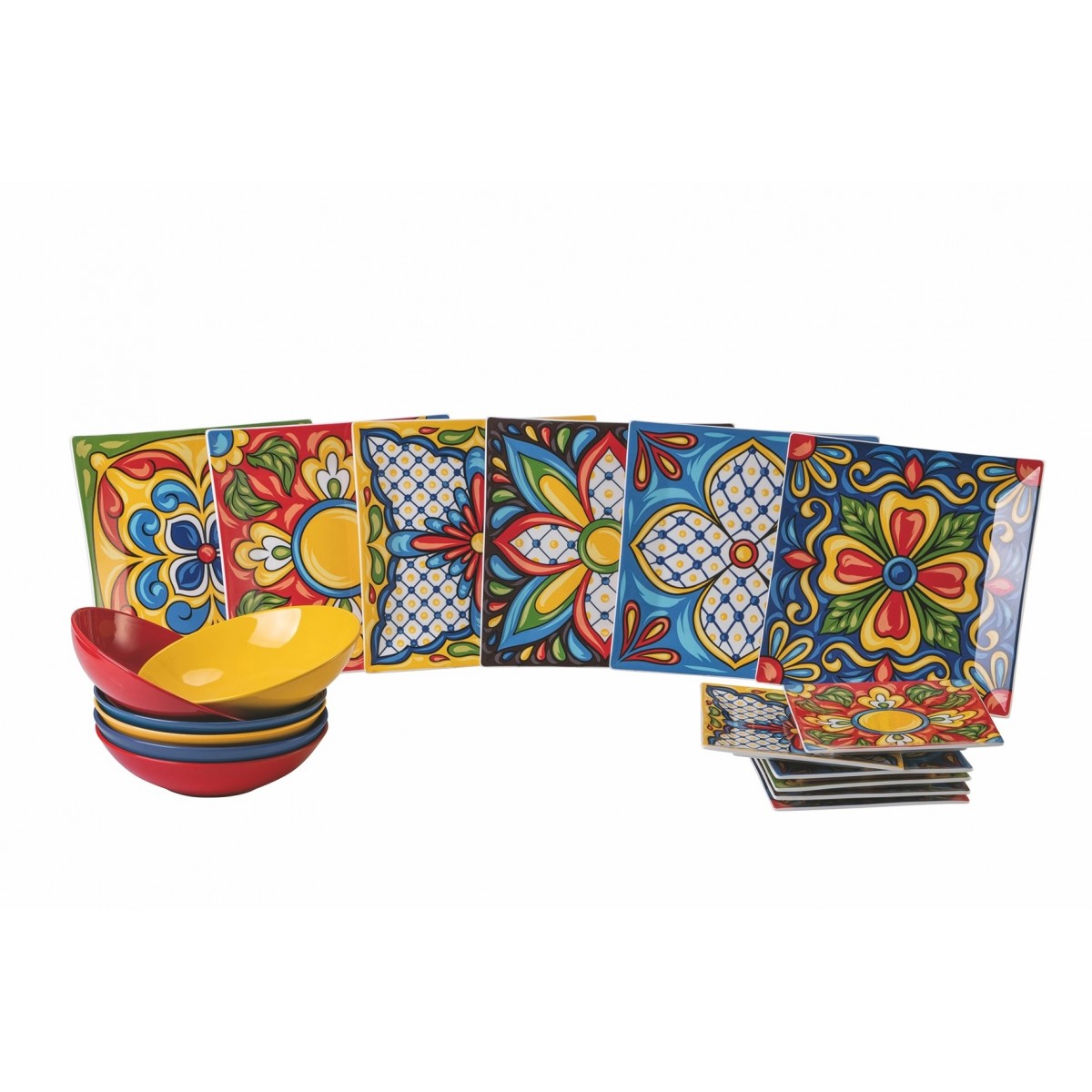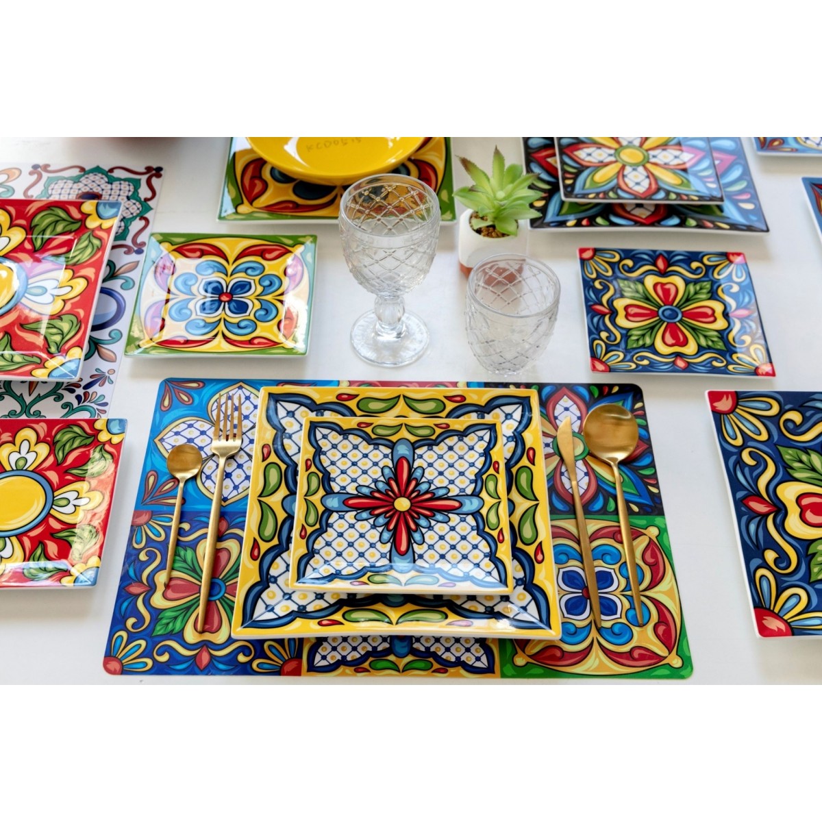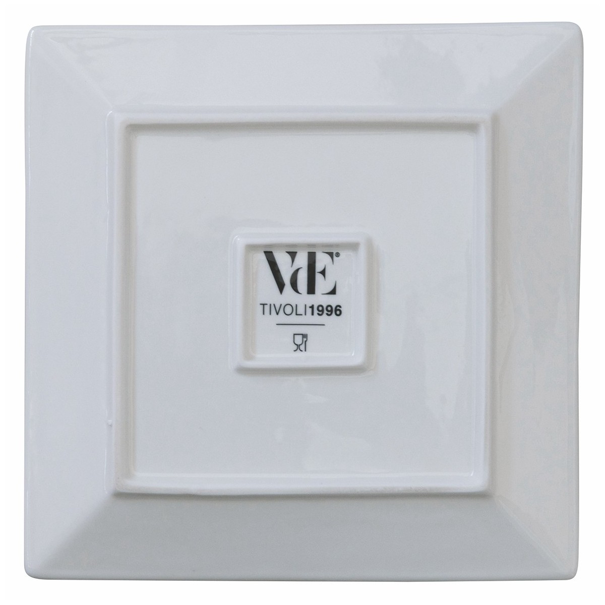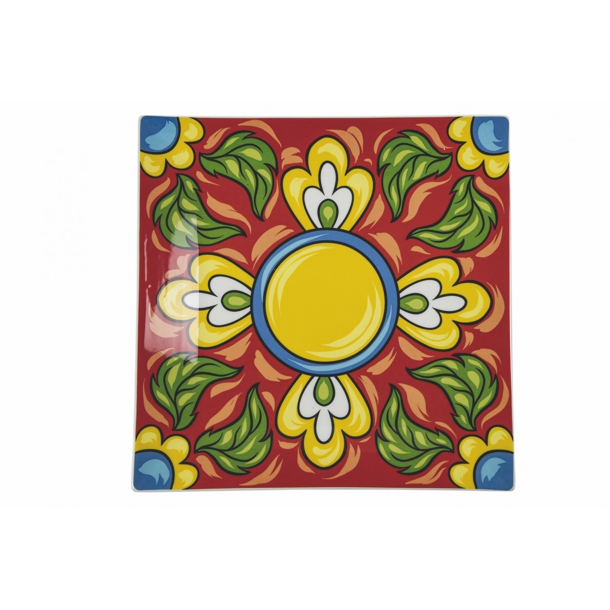 Riviera Maya Servizio tavola 18 pezzi Realizzato in porcellana e gres 6 posti tavola in 6 diversi colori nella stessa confezione Il servizio si compone di 6 piatti piani, 6 piatti fondi, 6 piatti frutta. Piatto piano quadrato: l. 25 p. 25 h. 1,5 h (peso: 1000 gr) Piatto fondo: Ø 20 x h. 5 cm (peso: 500 gr) Piatto frutta quadrato: l 17 x p. 17 x h. 1 cm (peso: 300 gr) Si consiglia lavaggio a mano