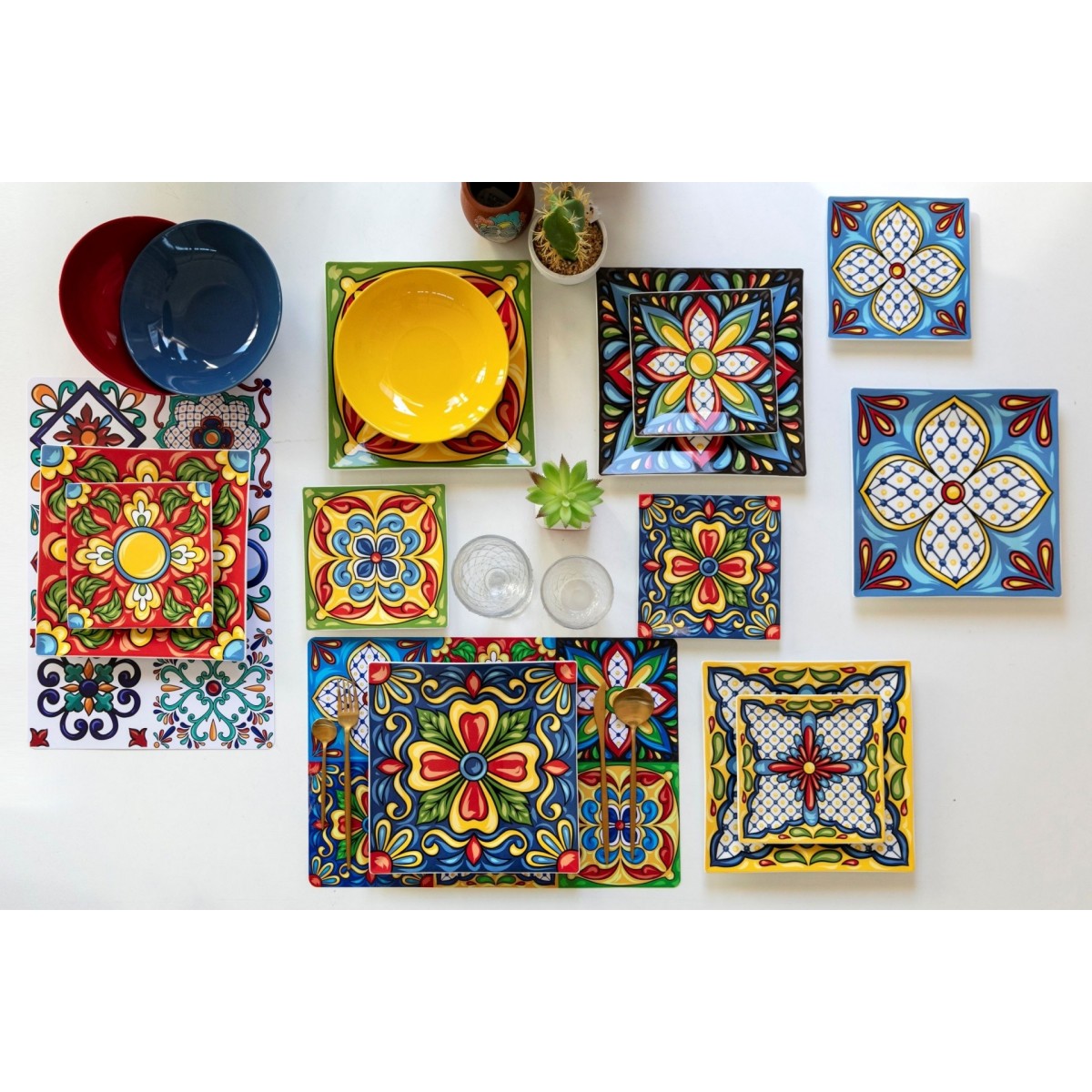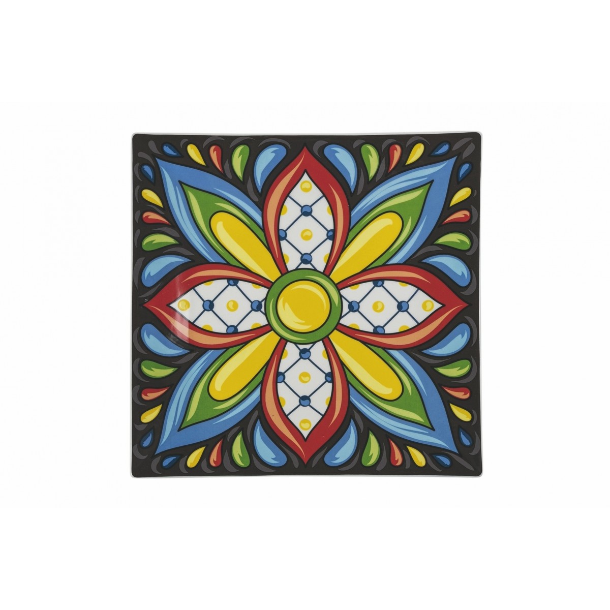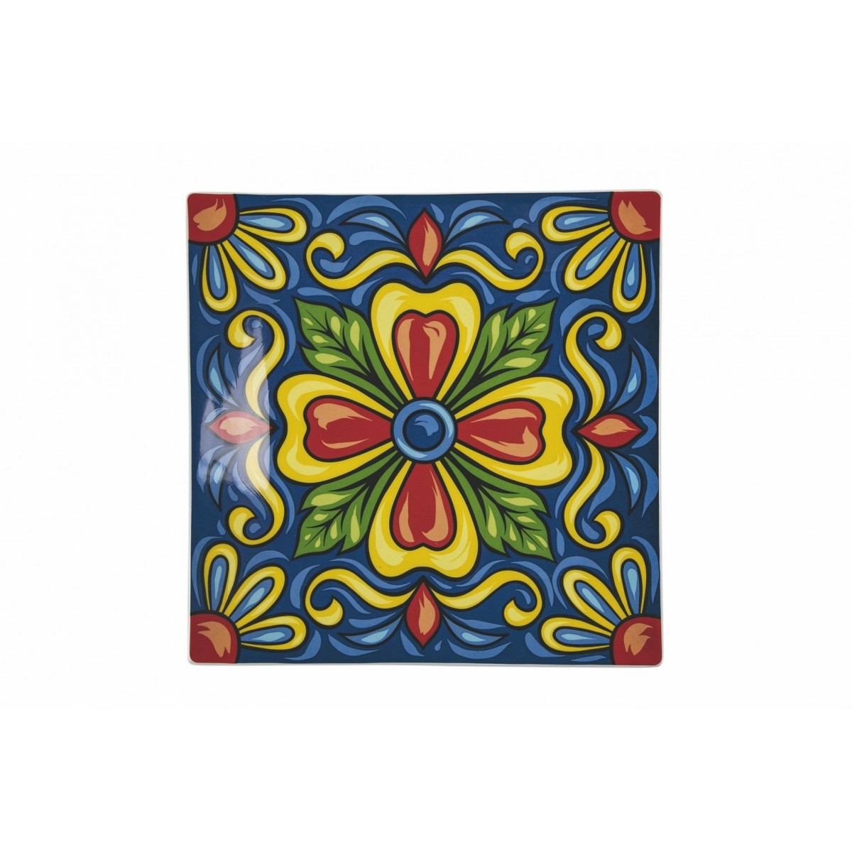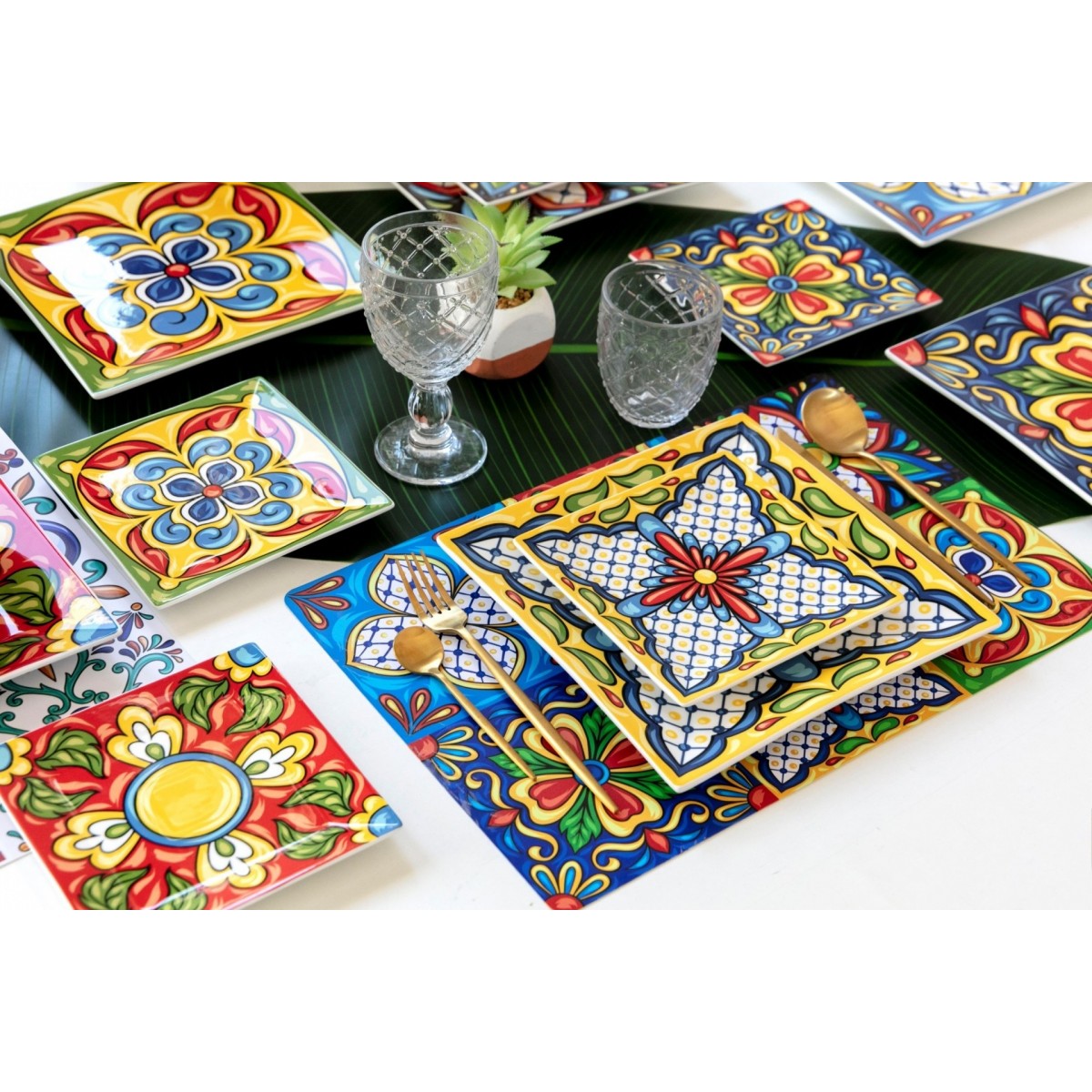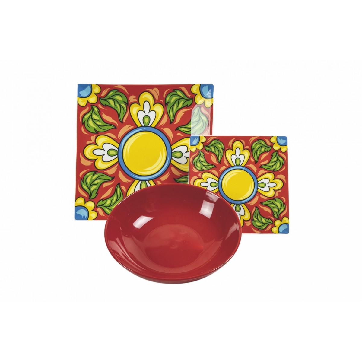 Riviera Maya Servizio tavola 18 pezzi Realizzato in porcellana e gres 6 posti tavola in 6 diversi colori nella stessa confezione Il servizio si compone di 6 piatti piani, 6 piatti fondi, 6 piatti frutta. Piatto piano quadrato: l. 25 p. 25 h. 1,5 h (peso: 1000 gr) Piatto fondo: Ø 20 x h. 5 cm (peso: 500 gr) Piatto frutta quadrato: l 17 x p. 17 x h. 1 cm (peso: 300 gr) Si consiglia lavaggio a mano
