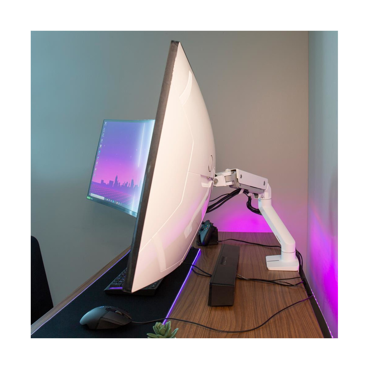 Immergiti in un’esperienza di visione coinvolgente con un braccio per monitor HX da scrivania o parete di livello professionale. Lo snodo inclinabile per monitor pesanti garantisce ad appassionati di videogame e professionisti tutta la libertà di spostare e posizionare display curvi o ultra-wide, come il Monitor Samsung Odyssey G9 da 49" con una curva di oltre 15 cm, ed ottenere una visione stabile e flessibile.