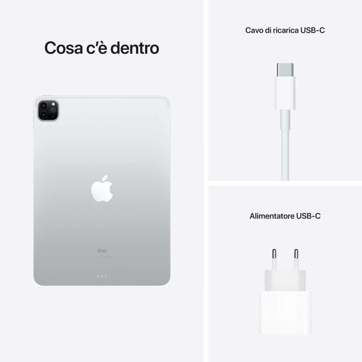 Apple iPad Pro 11" con Chip M1 (terza gen.) Wi-Fi 2TB - Argento. Dimensioni schermo: 27,9 cm (11"), Risoluzione del display: 2388 x 1668 Pixel, Tecnologia display: LED. Capacità memoria interna: 2048 GB. Famiglia processore: Apple M, Modello del processore: M1. RAM installata: 16 GB. Risoluzione fotocamera posteriore (numerico): 12 MP, Tipo di fotocamera posteriore: Doppia fotocamera, Risoluzione fotocamera frontale (numerico): 12 MP, Fotocamera frontale. Wi-Fi standard: Wi-Fi 6 (802.11ax). Peso: 466 g. Sistema operativo incluso: iPadOS 14. Colore del prodotto: Argento
