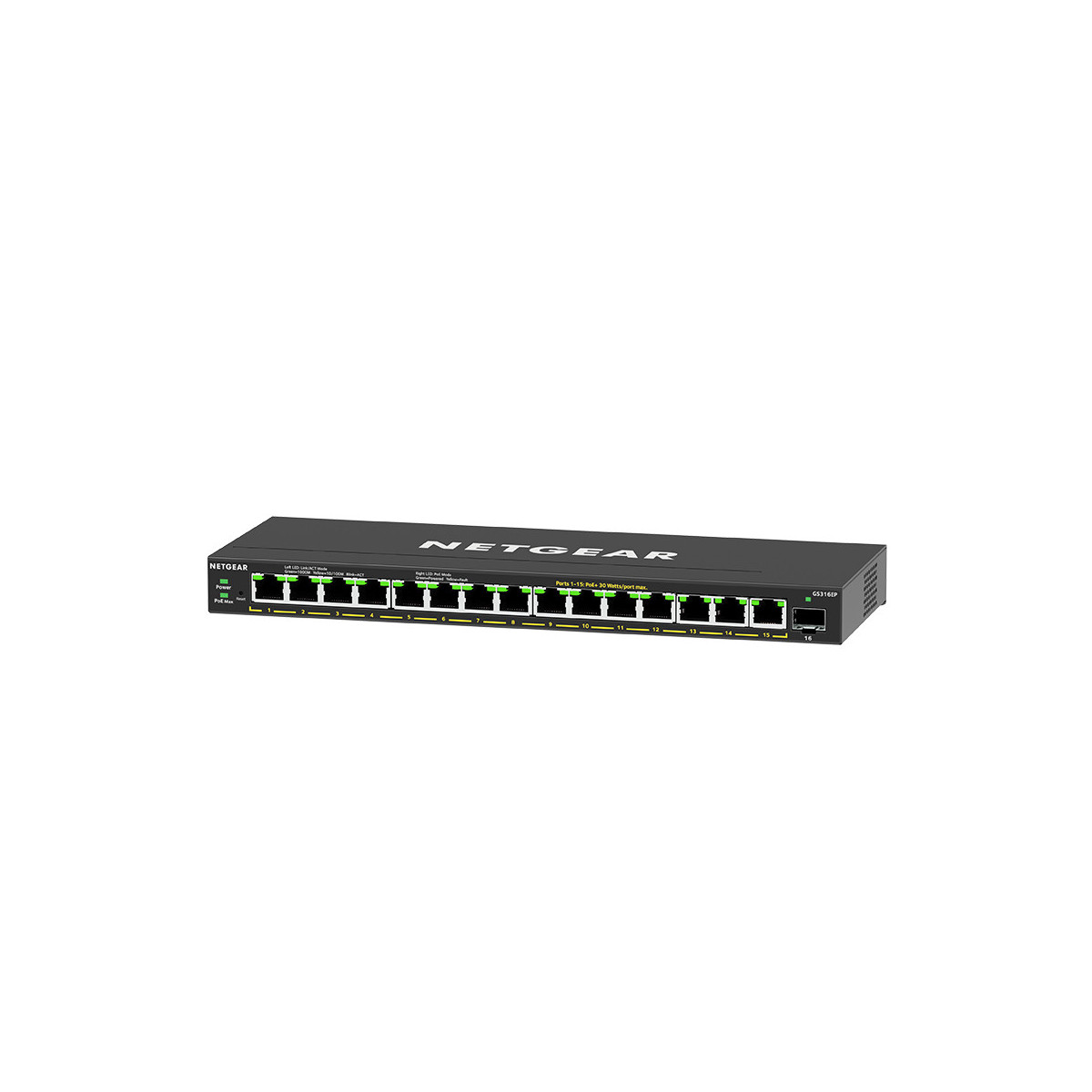Netgear GS316EP-100PES. Tipo interruttore: Gestito. Quantità di moduli SFP installati: 1. Full duplex. Dimensioni tavola MAC: 4000 voci, Capacità di commutazione: 28 Gbit/s. Standard di rete: IEEE 802.3,IEEE 802.3ab,IEEE 802.3af,IEEE 802.3at,IEEE 802.3u,IEEE 802.3x. Supporto Power over Ethernet (PoE)
