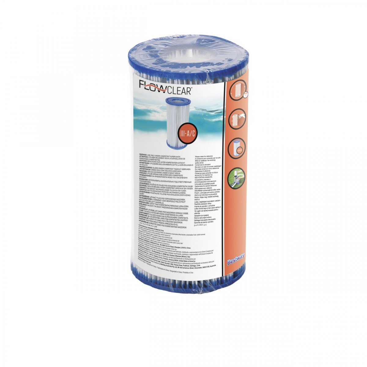 Bestway 58093. Tipo di prodotto: Cartuccia per pompa filtrante, Colore del prodotto: Blu, Bianco. Capacità di filtraggio: 1249 l/h, Capacità minima di pompaggio: 1,2 m³/h. Altezza: 90 mm, Diametro: 8 cm, Peso: 124 g. Tipo di imballo: Confezione in lamina, Larghezza imballo: 80 mm, Profondità imballo: 180 mm. Ordine minimo: 6 pezzo(i), Quantità per pallett: 864 pezzo(i)