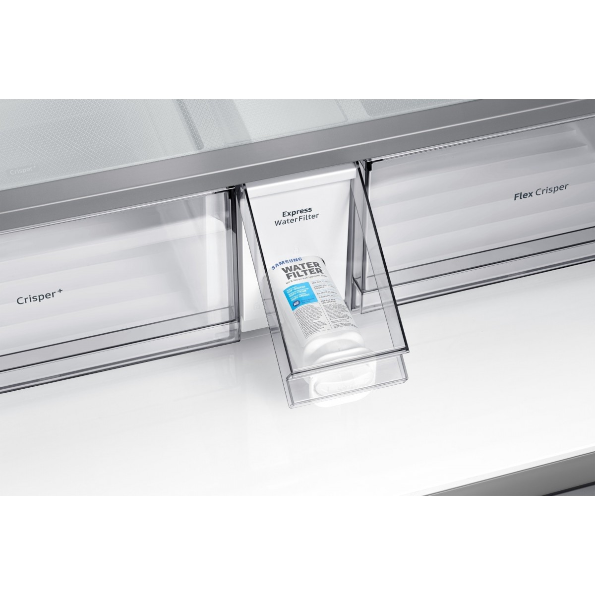 Samsung RF65A977FSR. Posizionamento dell'apparecchio: Libera installazione, Colore del prodotto: Acciaio inossidabile, Design: Porta americana. Capacità netta totale: 637 L, Classe climatica: SN-T, Classe emissione rumore: C. Capacità netta frigorifero: 387 L, Variabile di temperatura frigo: 3 - 5 °C. Capacità netta congelatore: 250 L, Posizione del congelatore: Posto in basso, Capacità di congelamento: 12 kg/24h. Lunghezza cavo: 1,5 m