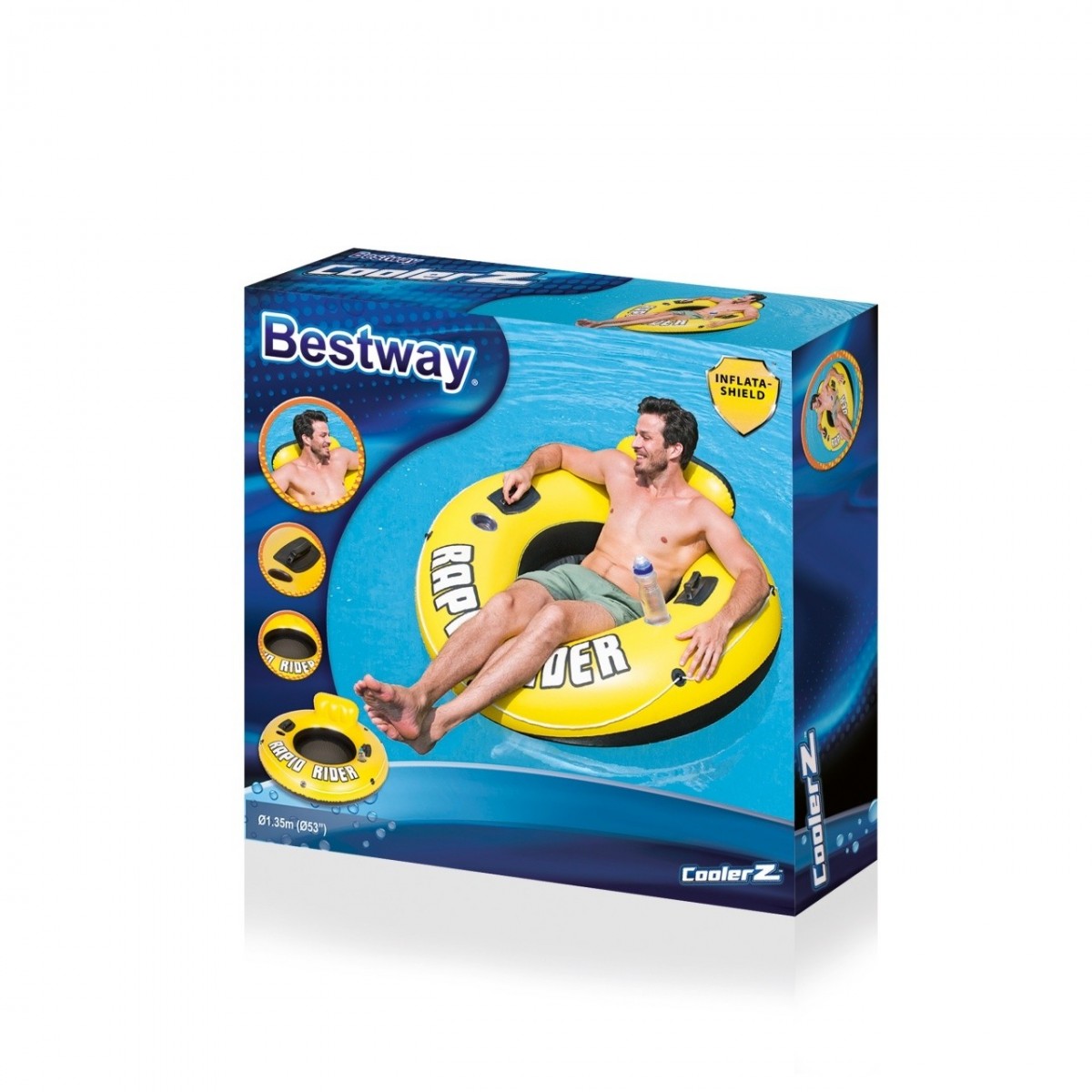 Bestway 43116. Colore del prodotto: Nero, Giallo, Tipo di prodotto: Ciambella da nuoto, Materiali: Vinile. Diametro: 122 cm, Altezza: 485 mm, Peso: 2,02 kg. Larghezza imballo: 300 mm, Profondità imballo: 300 mm, Altezza imballo: 95 mm. Quantità per pallett: 384 pz, Ordine minimo: 6 pz