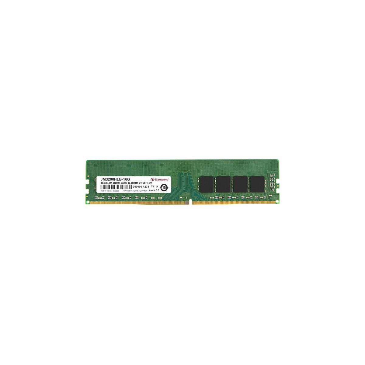 Transcend JM3200HLB-16G. Componente per: PC/server, RAM installata: 16 GB, Layout di memoria (moduli x dimensione): 2 x 8 GB, Tipo di RAM: DDR4, Velocità memoria: 3200 MHz, Fattore di forma memoria: 288-pin DIMM, Latenza CAS: 22