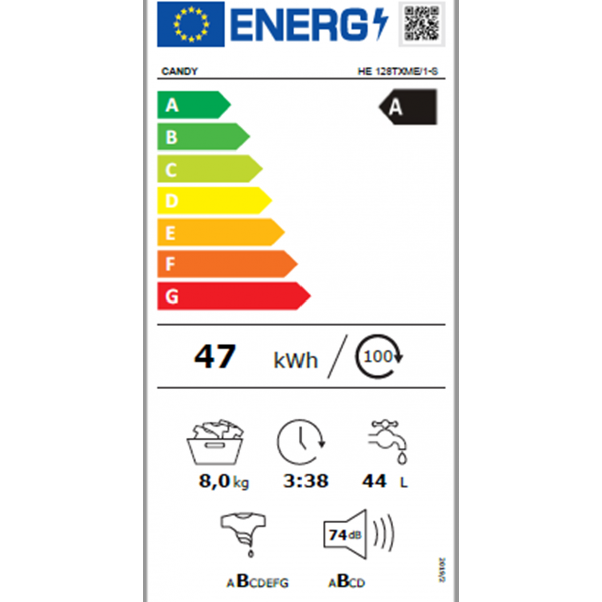 Candy HE 128TXME/1-S. Tipo di carica: Caricamento frontale. Capacità cestello: 8 kg, Classe di efficienza della centrifuga: B, Silenziosità (lavaggio): 74 dB, Velocità di centrifuga massima: 1200 Giri/min. Colore del prodotto: Bianco. Larghezza: 600 mm, Profondità: 530 mm, Altezza: 850 mm. Classe efficienza energetica: A