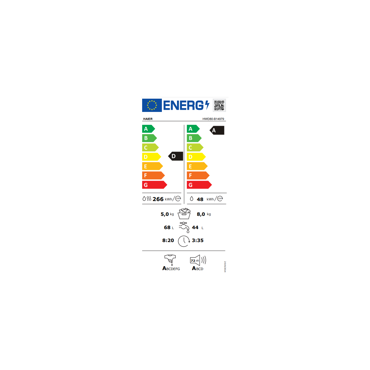 Haier I-Pro Series 7. Tipo di carica: Caricamento frontale, Posizionamento dell'apparecchio: Libera installazione, Colore del prodotto: Bianco. Capacità di asciugatura del cotone (kg): 5 kg, Capacità di lavaggio cotone (kg) 8 Kg Velocità di centrifuga massima: 1400 Giri/min, Classe di efficienza della centrifuga: A. Classe di efficienza energetica (lavaggio): A, Classe di efficienza energetica( lavaggio e asciugatura): D, Consumo di acqua (lavaggio): 44 L. Profondità: 460 mm, Larghezza: 590 mm, Altezza: 850 mm