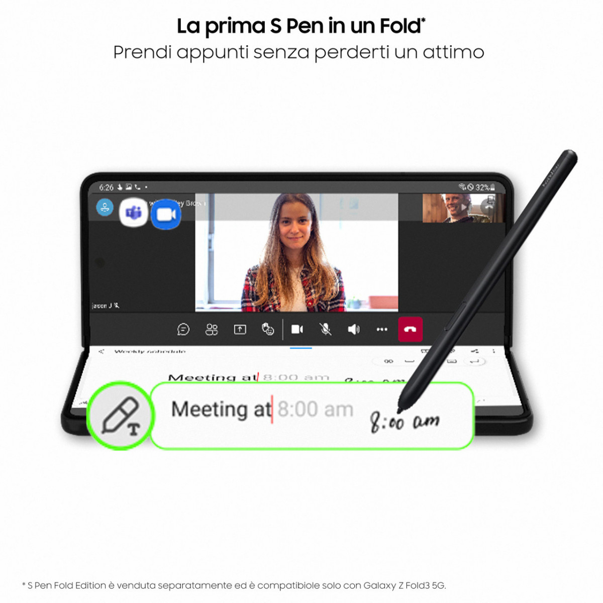 La prima S Pen su un pieghevole. Scrivi naturalmente. Prova quella precisione che le tue dita potevano solo immaginare, appoggiando la penna sullo schermo. E potrai guardare contenuti, videochiamare e fare molto altro ancora, a mani libere, con la modalità Flex.{{2}} Divide lo schermo in due, consentendoti di lavorare più agilmente, ad esempio effettuando una chiamata nella metà superiore e abbozzando delle idee sulla metà inferiore.