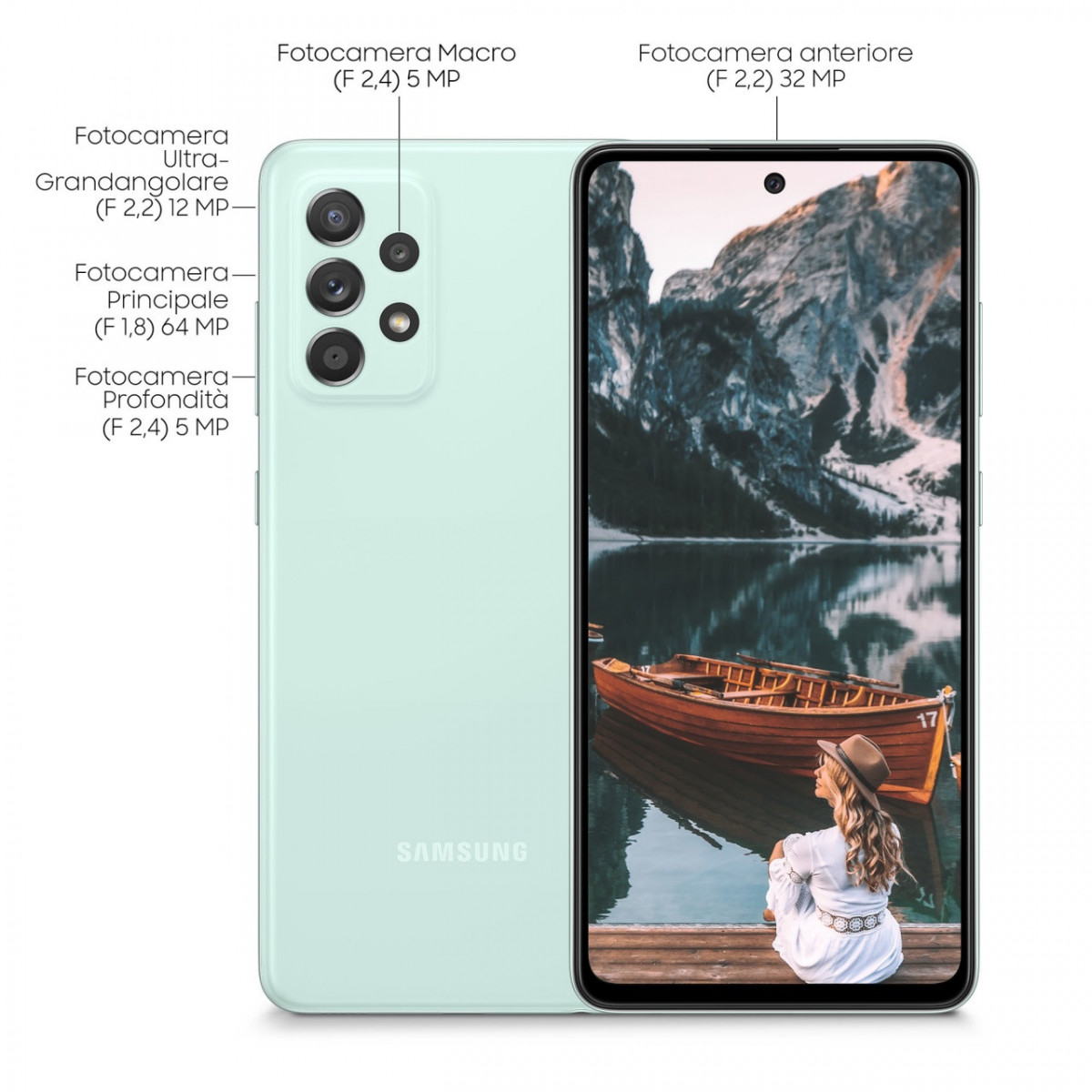 Samsung Galaxy A52s 5G Display 6.5” FHD+ Super AMOLED 128GB Awesome Green. Dimensioni schermo: 16,5 cm (6.5"), Risoluzione del display: 1080 x 2400 Pixel, Tipo di display: SAMOLED. Famiglia processore: Qualcomm. Capacità della RAM: 6 GB, Capacità memoria interna: 128 GB. Risoluzione fotocamera posteriore (numerico): 64 MP, Tipo di fotocamera posteriore: Telecamera per quad. Capacità della scheda SIM: Dual SIM ibrida. Sistema operativo incluso: Android 11. Capacità della batteria: 4500 mAh. Colore del prodotto: Colore menta. Peso: 189 g