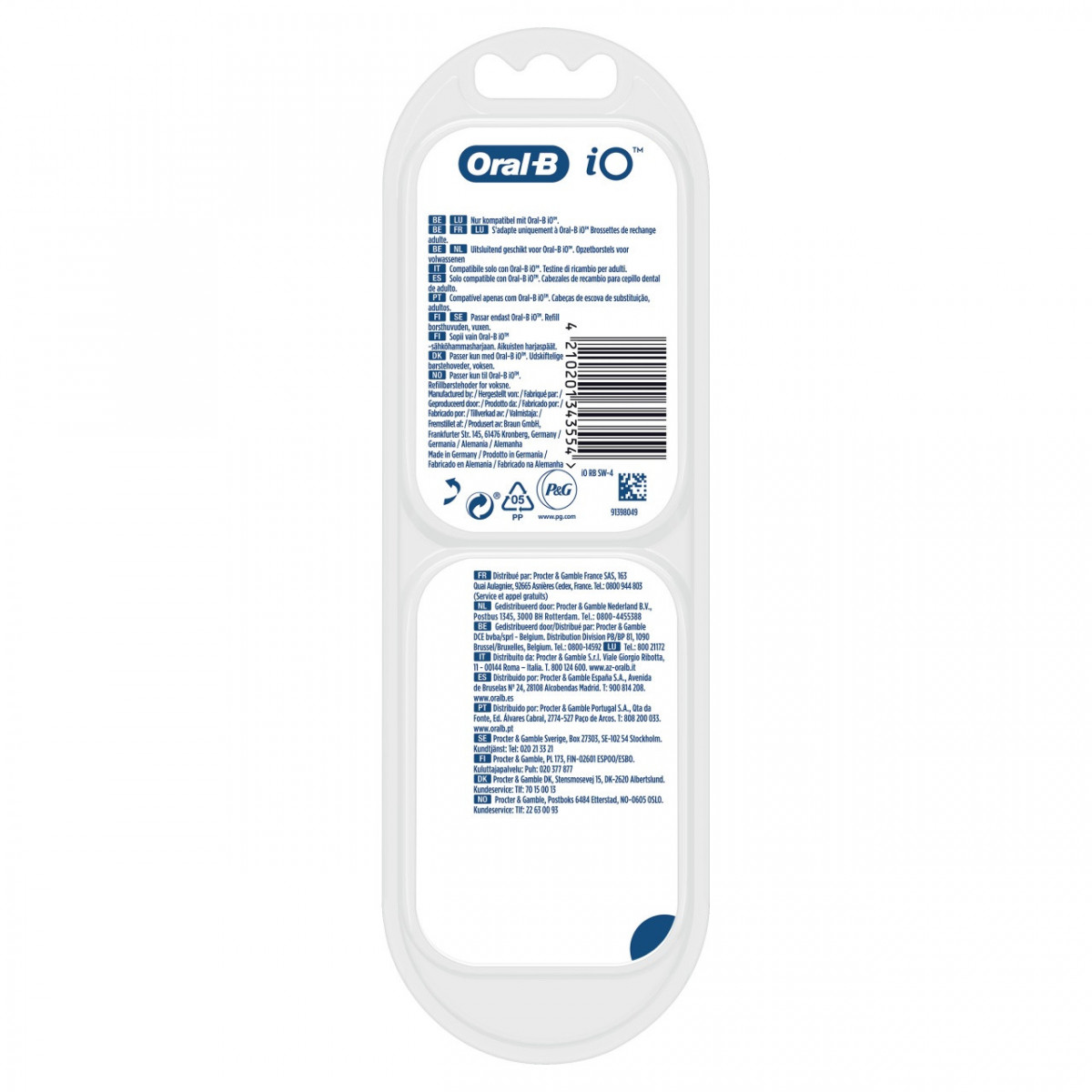 Oral-B iO Gentle Care 80346671. Numero di testine incluse: 4 pz, Colore del prodotto: Blu, Bianco, Peso: 32 g. Larghezza imballo: 22,8 mm, Profondità imballo: 74 mm, Altezza imballo: 234 mm. Quantità per pacco: 4 pz, Larghezza scatola principale: 14,9 cm, Lunghezza del cartone principale: 23,7 cm