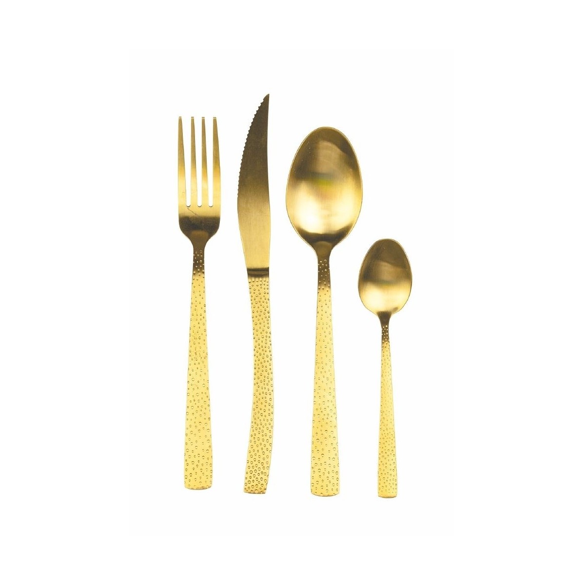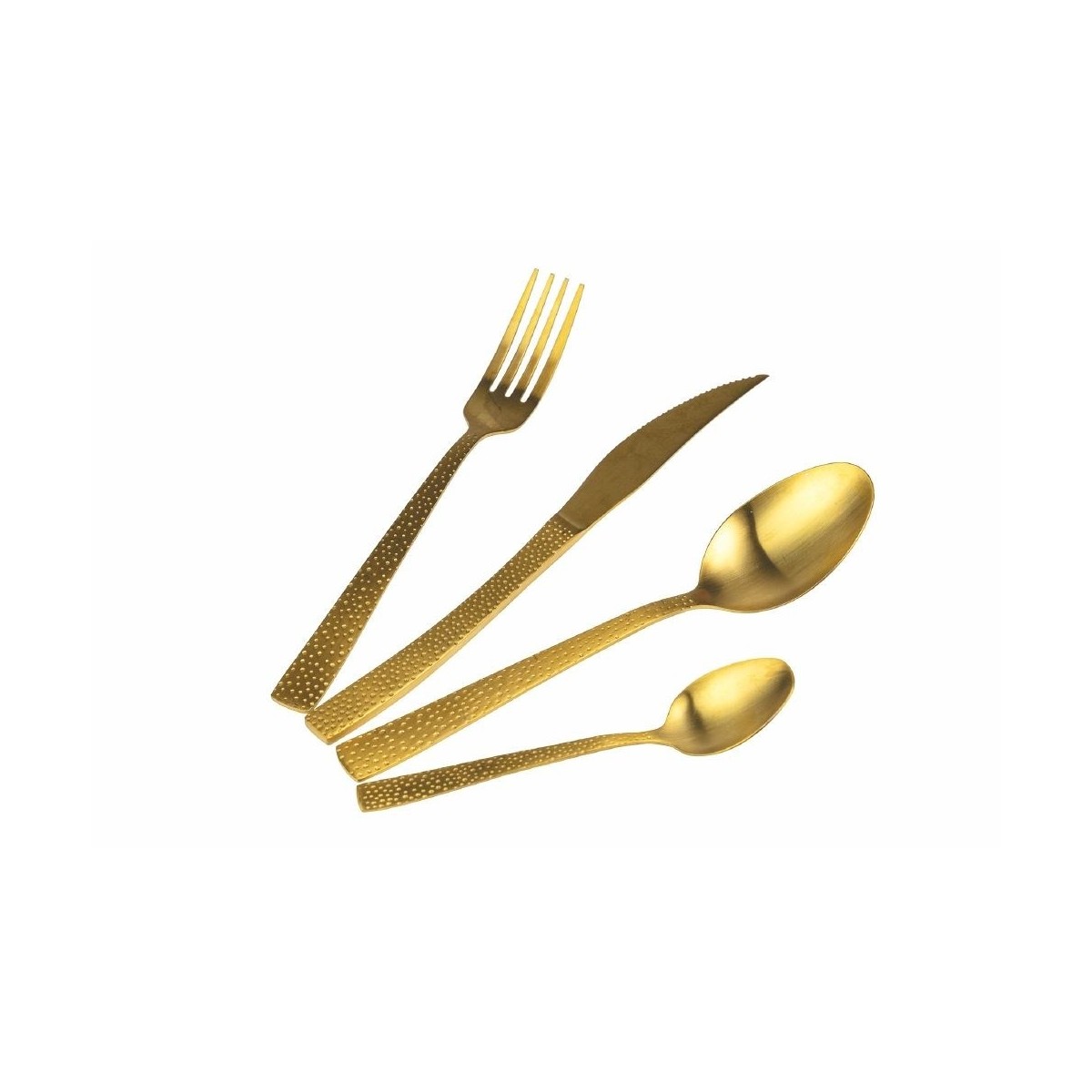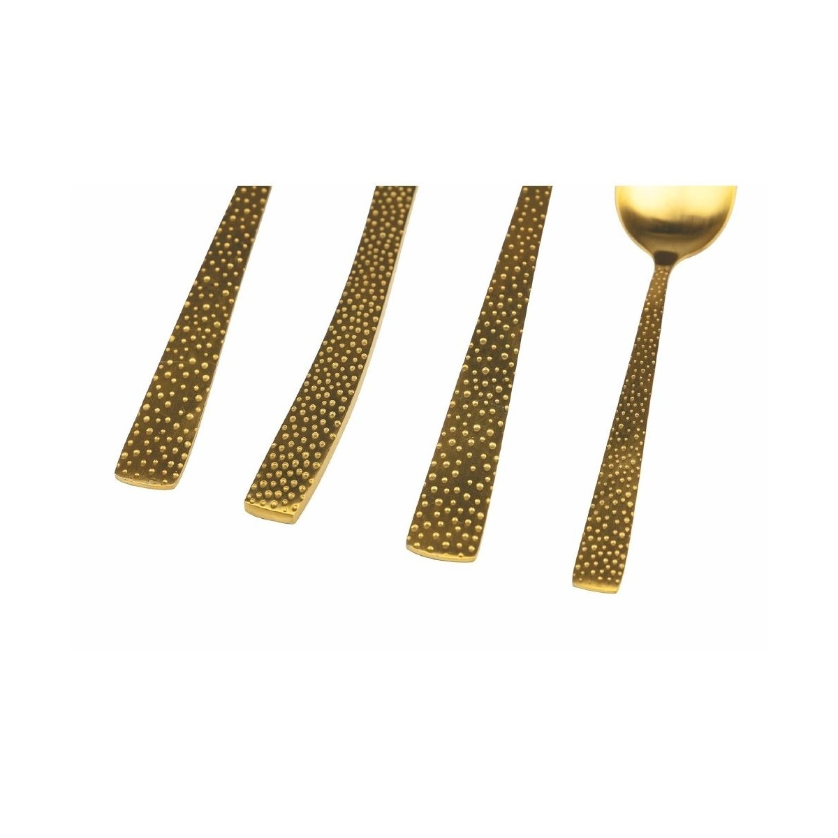Stone Set 24 posate In acciaio Gold Finitura opaca Misure coltello: l. 2 x p. 0,2 x h. 23 cm (peso 5 gr) Misure cucchiaino: l. 3 x p. 2 x h. 14 cm (peso 3 gr) Misure cucchiaio: l. 4 x p. 3 x h. 20,5 cm (peso 5 gr) Misure forchetta: l. 2,5 x p. 2,5 x h. 20,5 cm (peso 5 gr) Si consiglia lavaggio a mano
