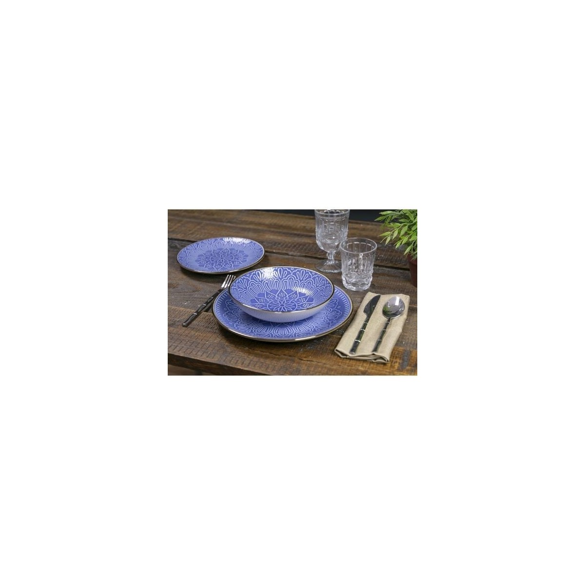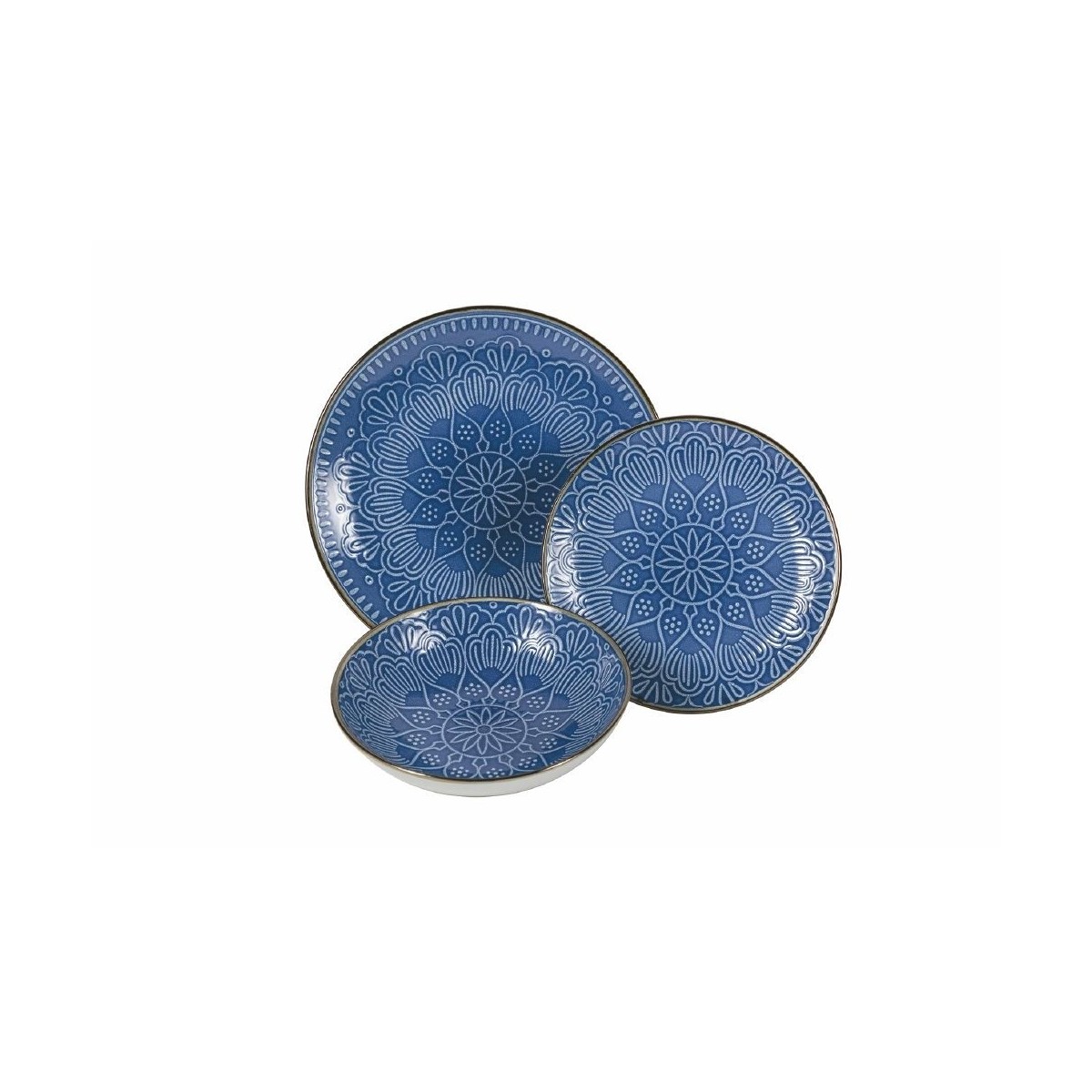 Baku Servizio tavola 18 pezzi Realizzato in hard dolomite Il servizio si compone di 6 piatti piani, 6 piatti fondi, 6 piatti frutta Piatto piano: Ø 27 x h. 3 cm Piatto fondo: Ø 20 x h. 5 cm Piatto frutta: Ø 21 x h. 3 cm Si consiglia lavaggio a mano Colore: blu
