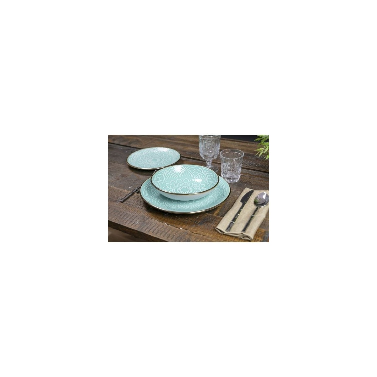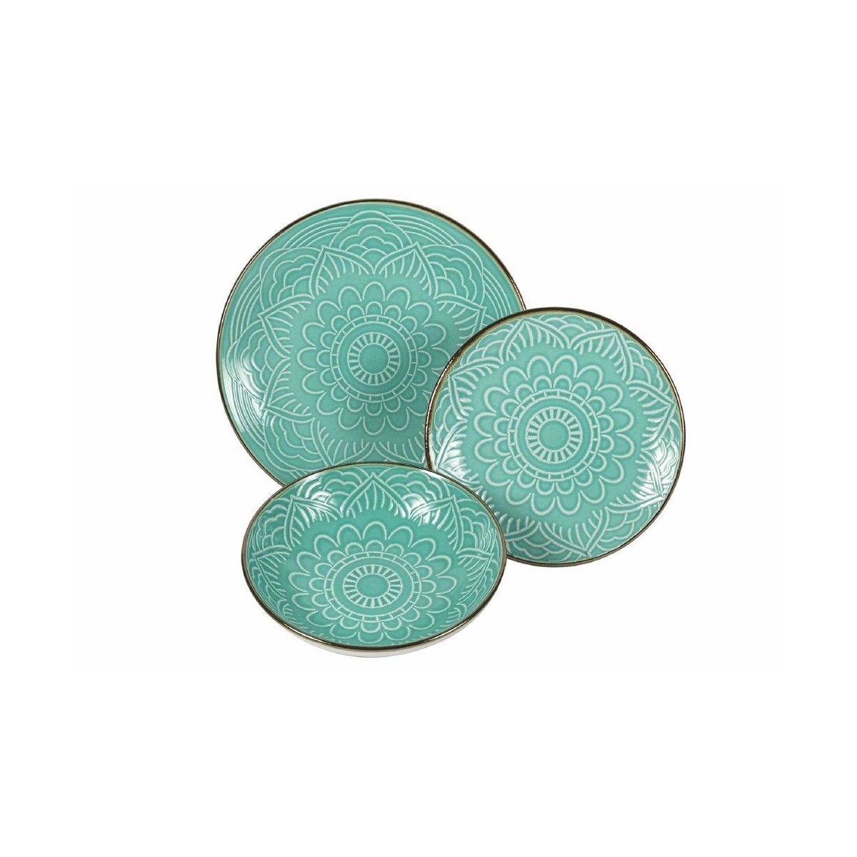 Baku Servizio tavola 18 pezzi Realizzato in hard dolomite Il servizio si compone di 6 piatti piani, 6 piatti fondi, 6 piatti frutta Piatto piano: Ø 27 x h. 3 cm Piatto fondo: Ø 20 x h. 5 cm Piatto frutta: Ø 21 x h. 3 cm Si consiglia lavaggio a mano Colore: turchese