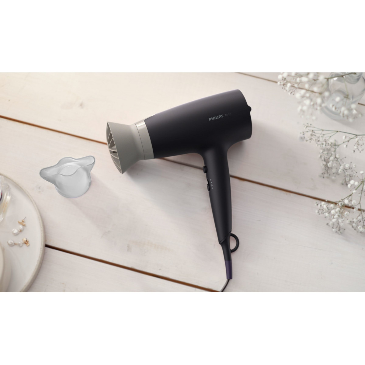 Philips 3000 series BHD341/30. Tipo motore: dC. Colore del prodotto: Nero, Grigio, Tipo di attaccatura: Anello di sospensione, Lunghezza cavo: 1,8 m. Potenza: 2100 W, Tensione di ingresso AC: 220-240 V. Altezza del beccuccio concentratore d'aria: 1,4 cm