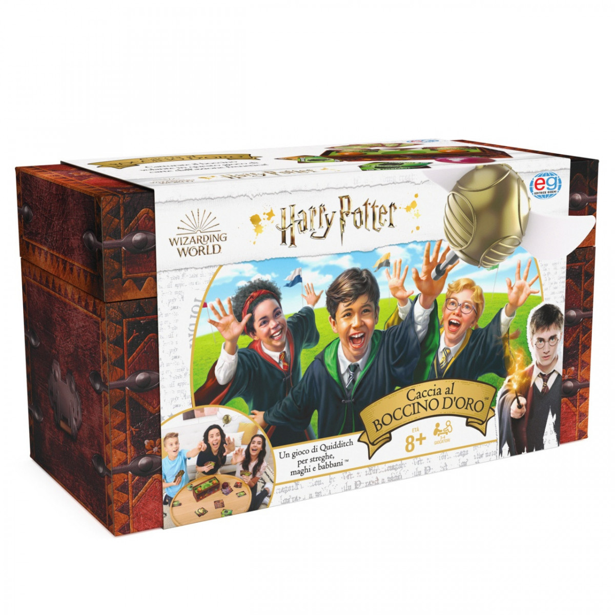 Porta a casa tua tutta la velocità e l'emozione di una vera sfida a Quidditch con Caccia al Boccino d'oro, un gioco di Quidditch per streghe, maghi e Babbani. Tutti giocano nello stesso momento: le carte passano di giocatore in giocatore, mentre tutti cercano di costruire set e guadagnare punti. Al centro dell'azione c'è un baule del Quidditch, con una pluffa, due bolidi, e il fondamentale Boccino d'oro. Quando usi alcune carte specifiche, questi oggetti magici entrano in azione. Una coppia di carte Cacciatore ti consentono di rubare il set di un altro giocatore, ma se hai guadagnato la pluffa sei al sicuro. Usa una coppia di carte bolide, afferra un bolide e lancialo addosso a un giocatore a scelta: se questi riesce a colpire il bolide a mezz'aria e a colpire un altro giocatore, quest'ultimo deve scartare tutta la propria mano. L'azione scorre più rapida di una Nimbus 2000: le carte cambiano di mano, i set finiscono sul tavolo e i bolidi colpiscono il bersaglio. Quando il Boccino d'oro decolla dal baule, afferralo: guadagnerai punti extra. Il gioco finisce quando qualcuno afferra il boccino, e il giocatore con più punti vince. Per un'azione e un divertimento ad alta velocità, gioca a Caccia al Boccino d'oro con parenti e amici (magici... o Babbani). 3-4 giocatori, dagli 8 anni in su.