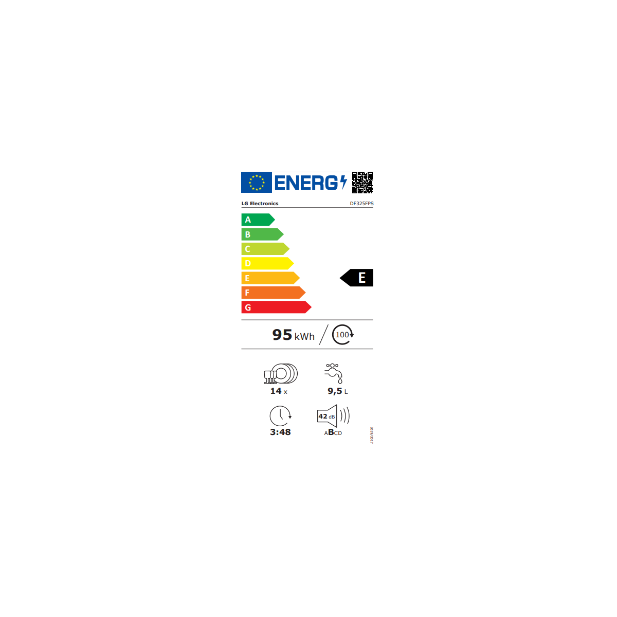 LG DF325FPS. Posizionamento dell'apparecchio: Libera installazione, Dimensione: Dimensione massima (60 cm), Colore della porta: Platino. Numero di coperti: 14 coperti, Emissione acustica: 42 dB, Programmi speciali: Delicato, Economico, Intensivo, Rapido, Risciacquo, Vapore, Turbo. Regolazione piedini: 3 cm. Consumo di acqua per ciclo: 9,6 L, Scala di efficienza energetica: Da A+++ a D, Consumo di energia per ciclo: 0,846 kWh. Larghezza: 600 mm, Profondità: 598 mm, Altezza: 845 mm