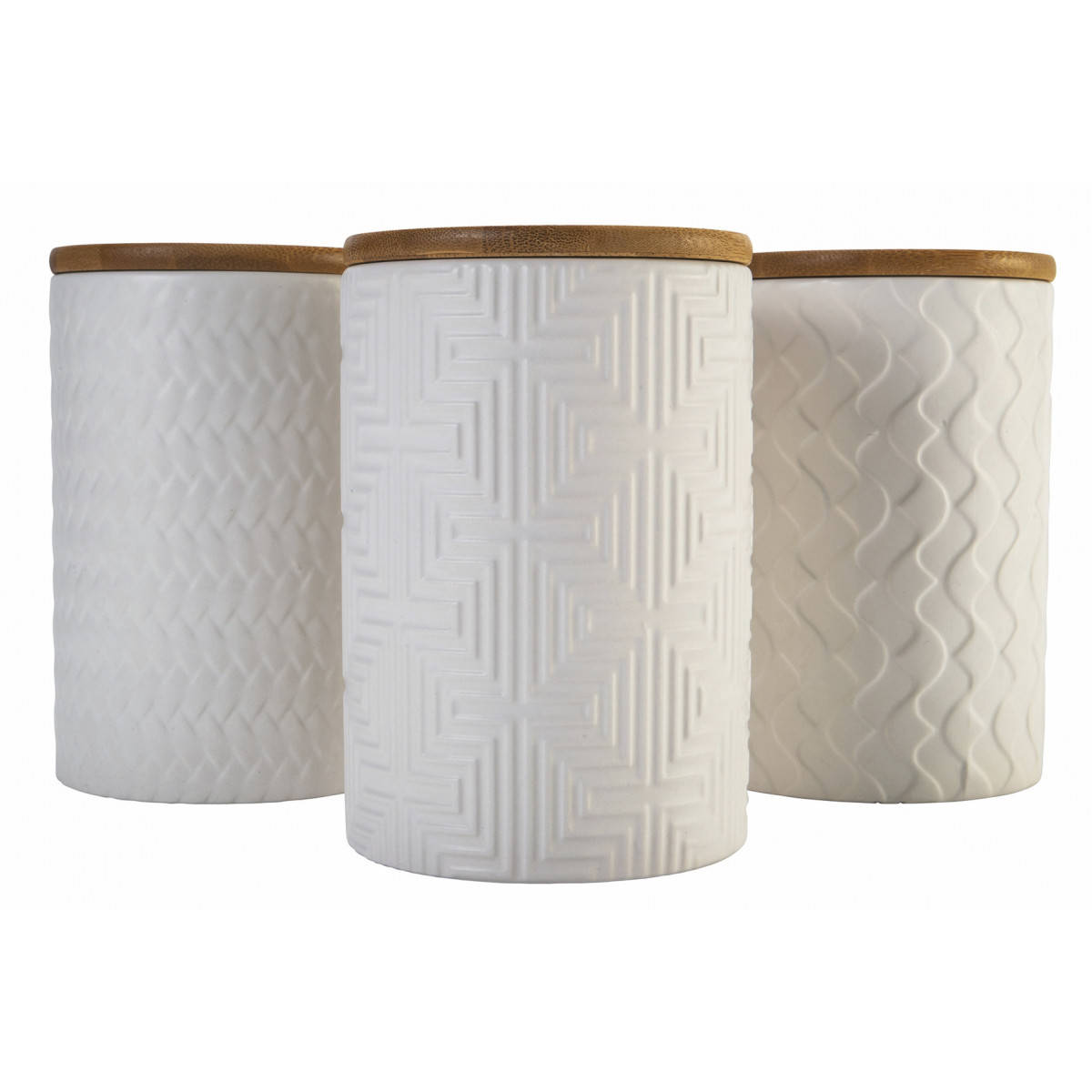 Geometrie Set 3 barattoli In dolomite Coperchio in bamboo Chiusura galvanizzata in silicone Finitura matt Misure: Ø 10 x h. 14,8 cm Decoro in rilievo Lavabili in lavastoviglie Capacità : 700 ml Colore: bianco