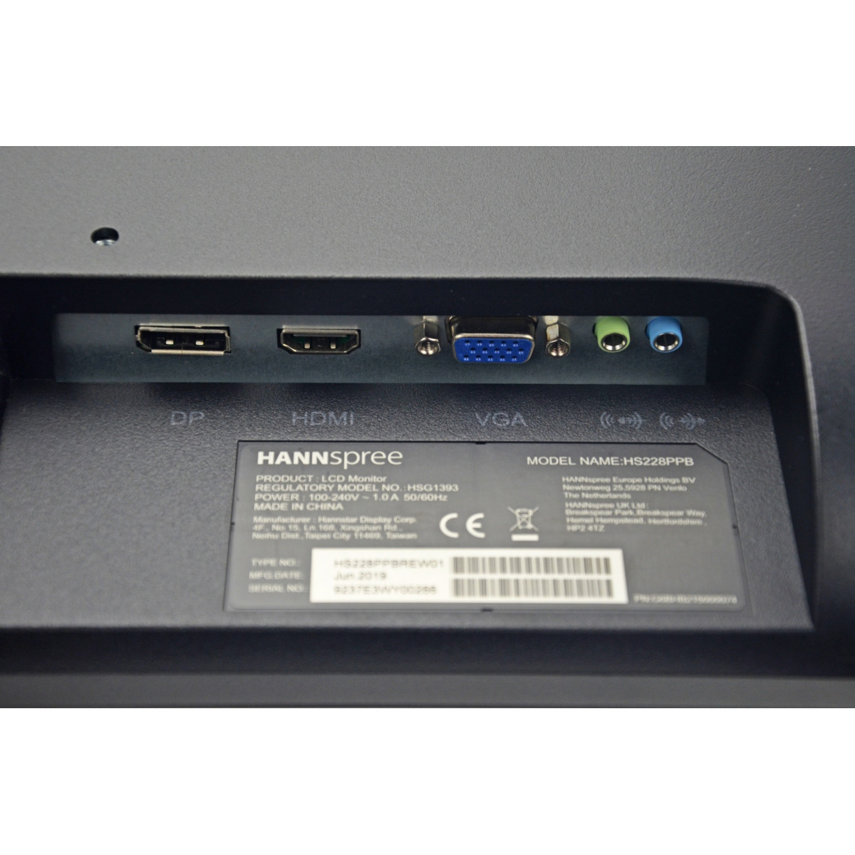 Hannspree HS228PPB. Dimensioni schermo: 54,6 cm (21.5"), Risoluzione del display: 1920 x 1080 Pixel, Tipologia HD: Full HD, Tecnologia display: LED, Tempo di risposta: 5 ms, Rapporto d'aspetto nativo: 16:9, Angolo di visualizzazione (orizzontale): 178°, Angolo di visualizzazione (verticale): 178°. Altoparlanti incorporati. Montaggio standard VESA. Colore del prodotto: Nero