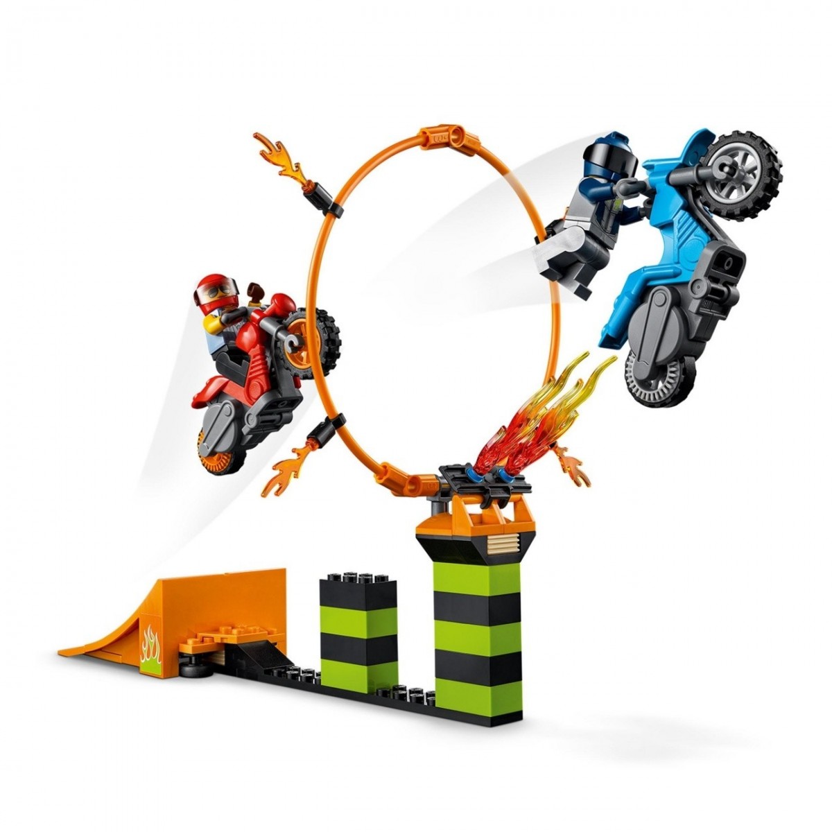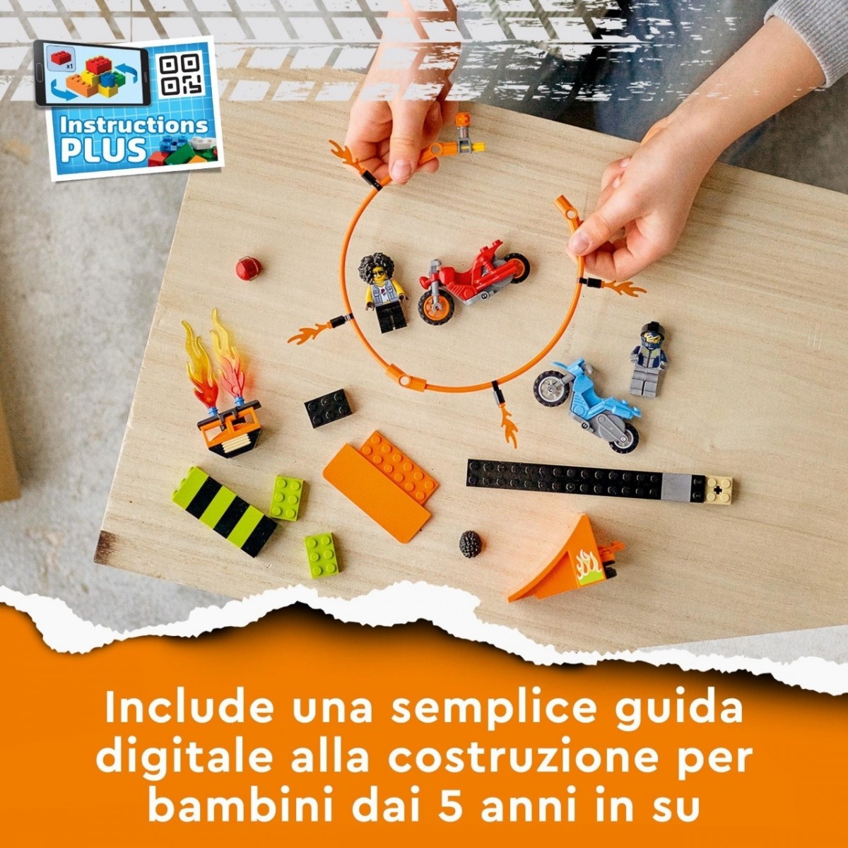 I piccoli dallo spirito competitivo saranno conquistati da questo set LEGO City Competizione acrobatica (60299) per bambini dai 5 anni in su: la confezione include 2 moto con meccanismo a spinta che permette di effettuare fantastiche acrobazie ad alta quota. E la minifigura del pilota Duke DeTain, della serie TV LEGO City, non farà che aggiungere adrenalina all'esperienza! I bambini potranno configurare la rampa di lancio come desiderano e divertirsi col cerchio di fuoco.
