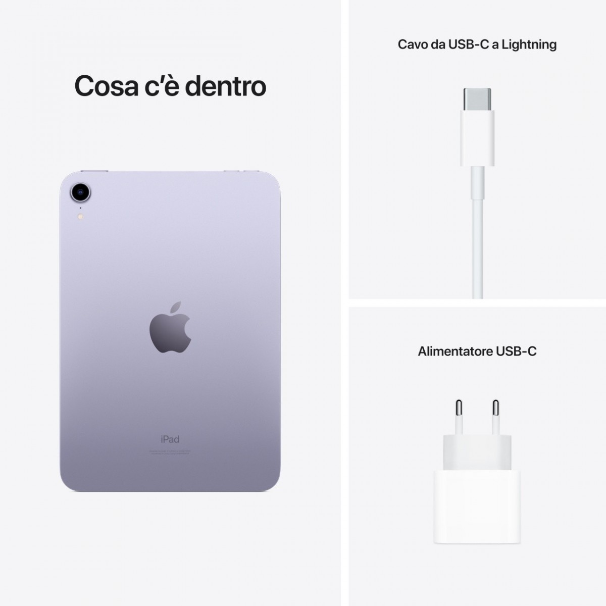 Apple iPad mini Wi-Fi 64GB - Purple. Dimensioni schermo: 21,1 cm (8.3"), Risoluzione del display: 2266 x 1488 Pixel, Tecnologia display: LED. Capacità memoria interna: 64 GB. Famiglia processore: Apple, Modello del processore: A15. Risoluzione fotocamera posteriore (numerico): 12 MP, Tipo di fotocamera posteriore: Fotocamera singola, Risoluzione fotocamera frontale (numerico): 12 MP, Fotocamera frontale. Wi-Fi standard: Wi-Fi 6 (802.11ax). Peso: 293 g. Sistema operativo incluso: iPadOS 15. Colore del prodotto: Porpora