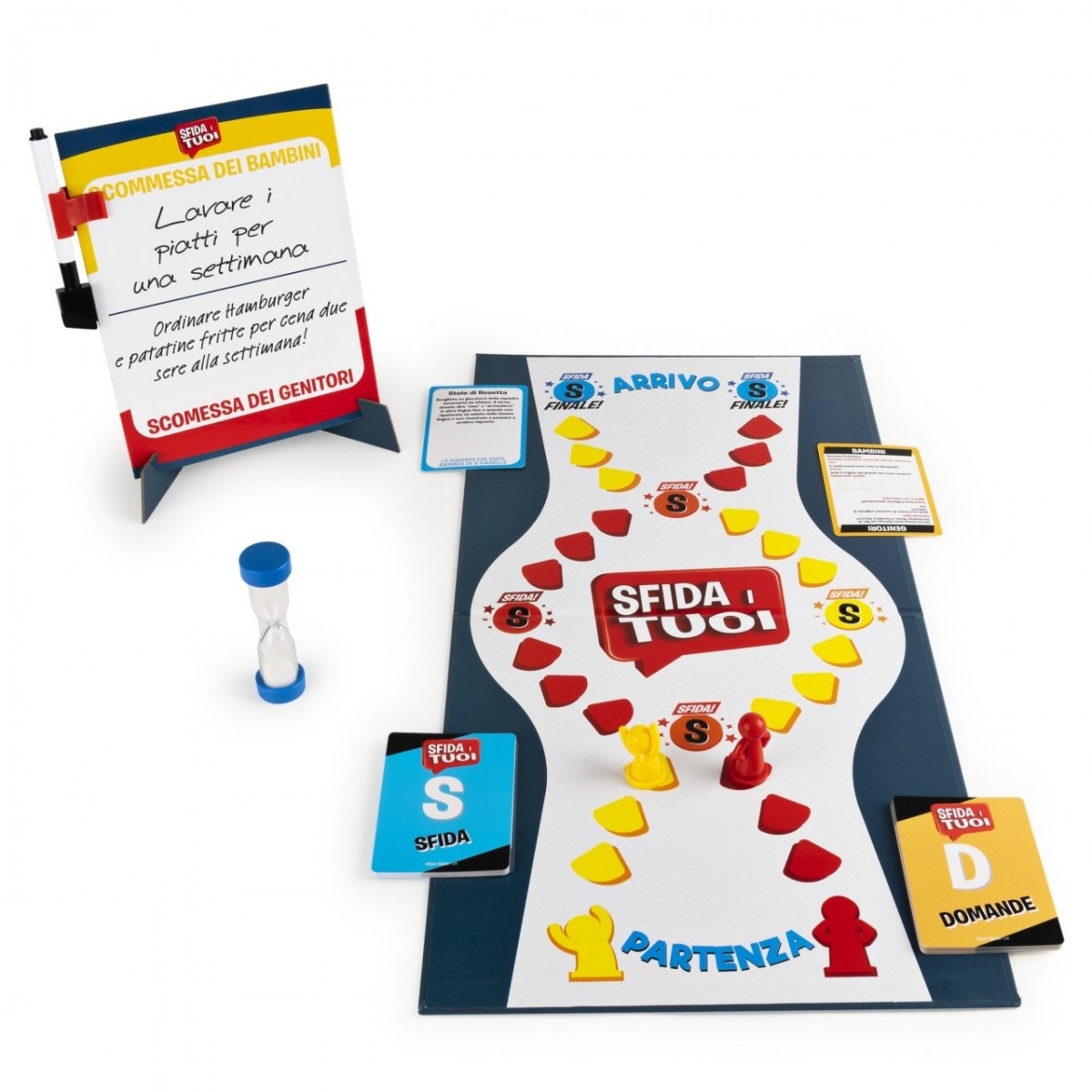 Sfida i Tuoi è la challenge finale in famiglia nella quale i bambini competono contro i genitori per la supremazia in casa! Ce la faranno i bambini a battere i genitori?: ogni squadra deve scommettere quale penitenza è disposto a fare prima che il gioco possa iniziare. Cosa siete disposti a fare se perdete? Lavare i piatti? Premiare la squandra vincente con una serata al cinema? Usate il pennarello cancellabile a secco e la lavagna delle scommesse per segnare la penitenza, quindi iniziate la sfida! Ogni squadra legge le domande trivia dedicate, avanzando sul tabellone con la propria pedina ad ogni rispostacorretta. Se atterrate su una casella Sfida gareggiate squadra contro squadra in una sfida divertente. Raggiungete per primi l'arrivo sul tabellone e superate un'ultima sfida per essere incoronati vincitori e godetevi la scommessa che avete appena vinto! In questa serata di giochi in famiglia, la posta in gioco non è mai stata così alta o più divertente! Da 2 a 6 giocatori, dagli 8 anni in su.