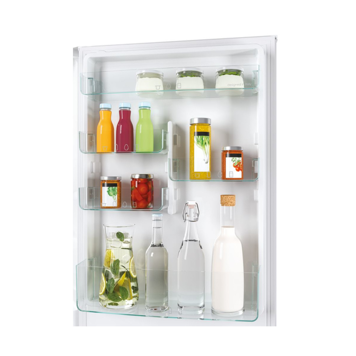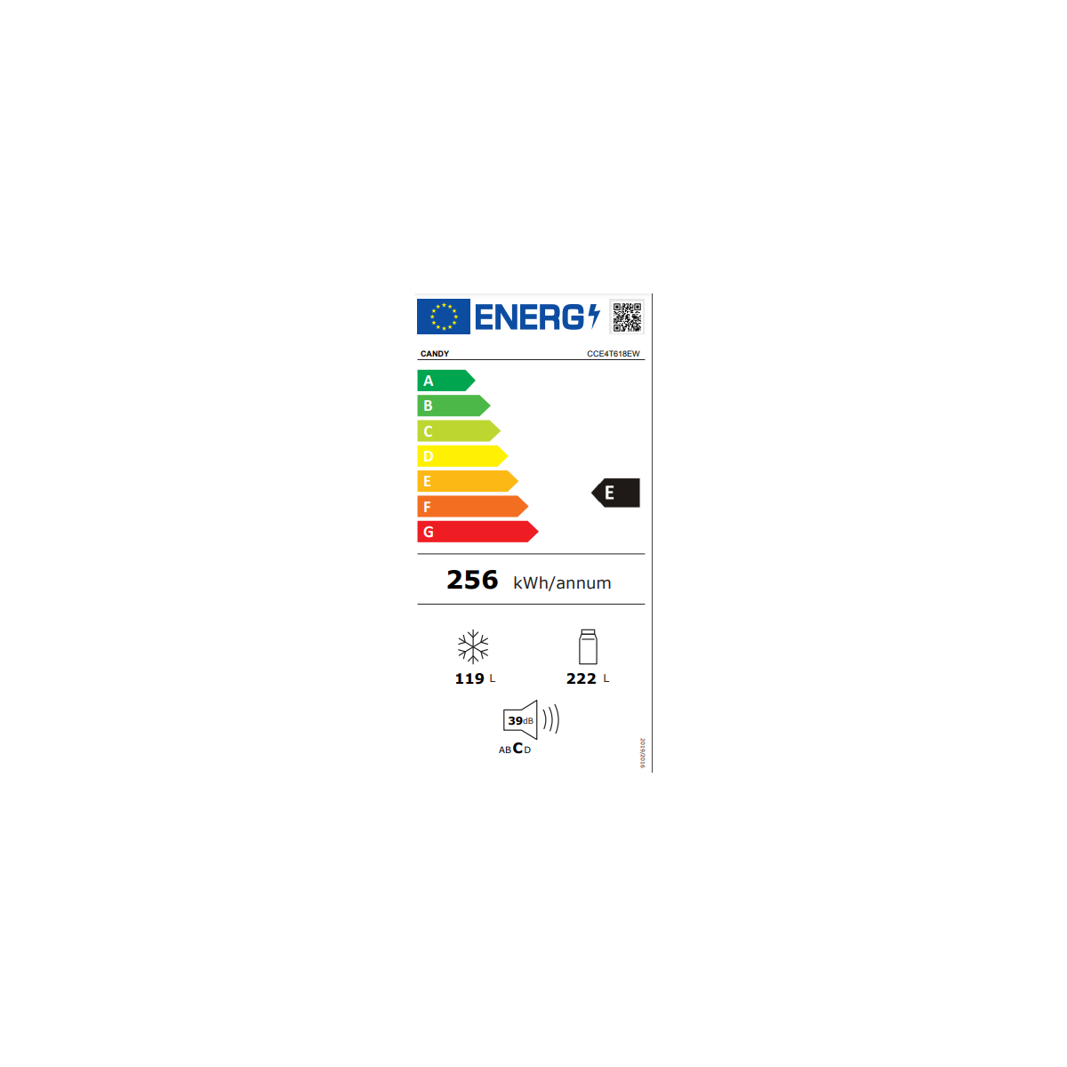 Candy CCE4T618EW. Capacità netta totale: 341 L. Cerniera porta: Destra. Classe climatica: Starfish, Emissione acustica: 39 dB. Capacità netta frigorifero: 222 L, Numero di ripiani frigorifero: 3, Numero di cassetti per verdura: 1. Capacità netta congelatore: 119 L, Capacità di congelamento: 4 kg/24h, No Frost (congelatore). Classe efficienza energetica: E, Consumo energetico annuo: 256 kWh. Colore del prodotto: Bianco