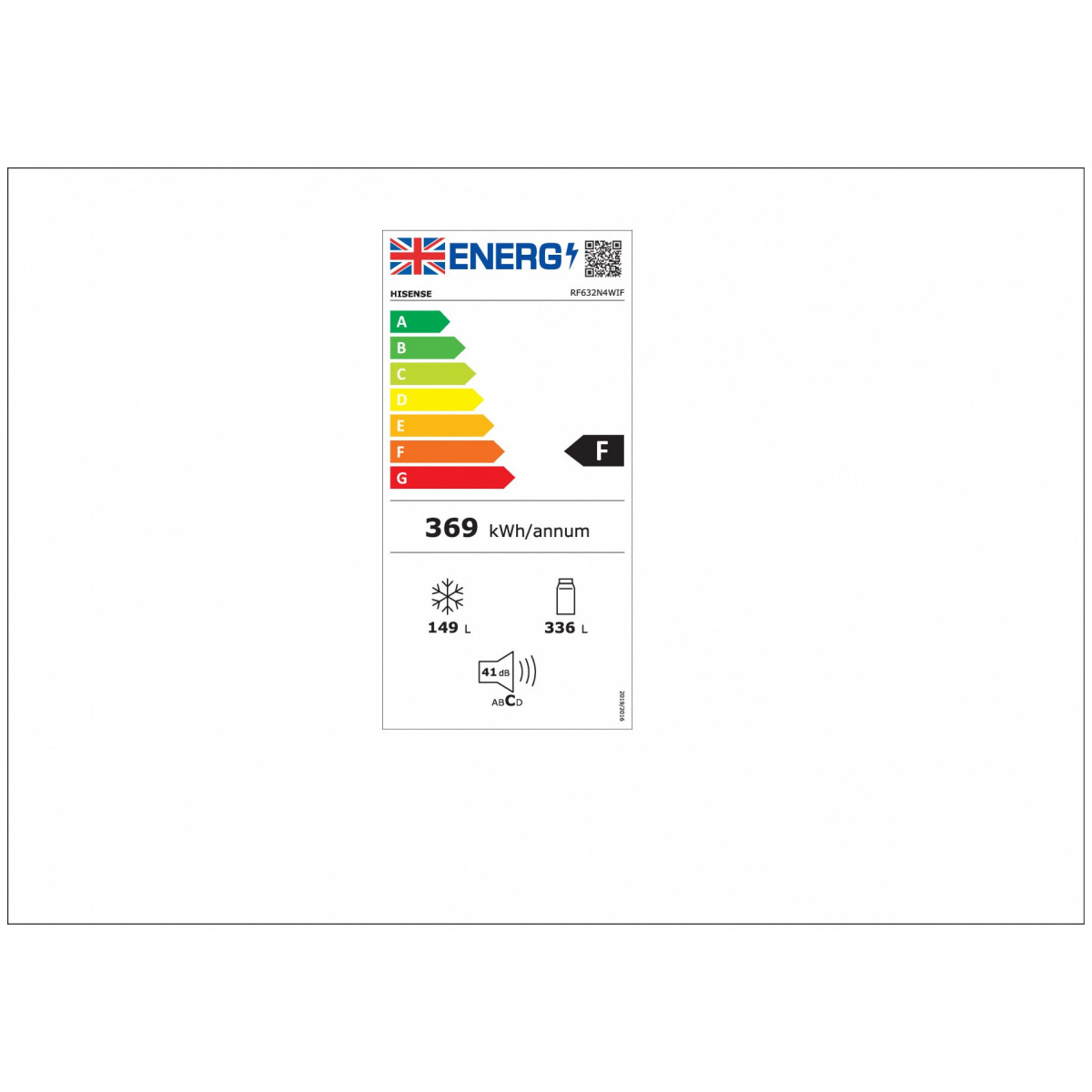 Hisense RF632N4WIF. Posizionamento dell'apparecchio: Libera installazione, Colore del prodotto: Metallico, Product design: Porta francese. Capacità netta totale: 485 L, Classe emissione rumore: C, Emissione acustica: 41 dB. Capacità netta frigorifero: 336 L. Capacità netta congelatore: 149 L, Posizione del congelatore: Posto in basso, Capacità di congelamento: 5,5 kg/24h. Classe efficienza energetica: F, Consumo energetico annuo: 368 kWh, Consumo d'energia: 0,989 kWh/24h