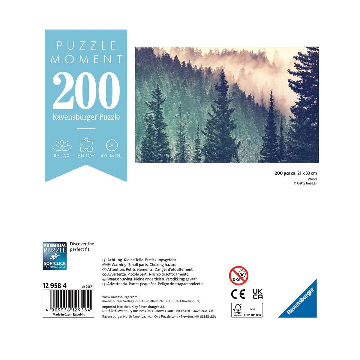 Ravensburger Wood. Tipo: Puzzle. Numero di pezzi del puzzle: 200 pz. Genere: Landscape, Pubblico di destinazione: Bambini e Adulti, Genere consigliato: Ragazzo/Ragazza, Età consigliata (min): 14 anno/i. Larghezza: 330 mm, Altezza: 210 mm