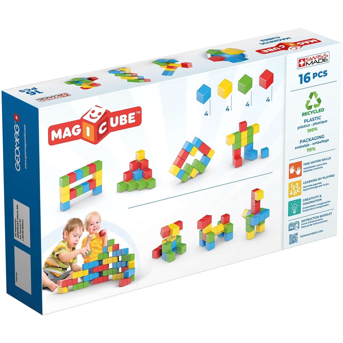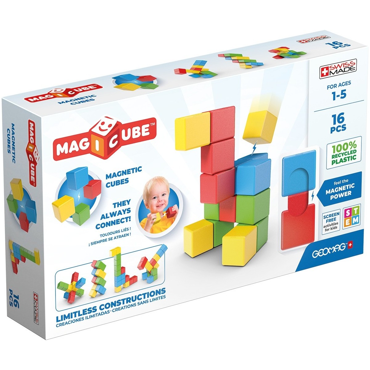 Geomag MagiCube FullColor Recycled Try me. Numero di pezzi: 16 pz, Colore del prodotto: Multicolore, Genere consigliato: Ragazzo/Ragazza, Età consigliata (min): 1 anno/i. Peso dell'imballo: 530,6 g