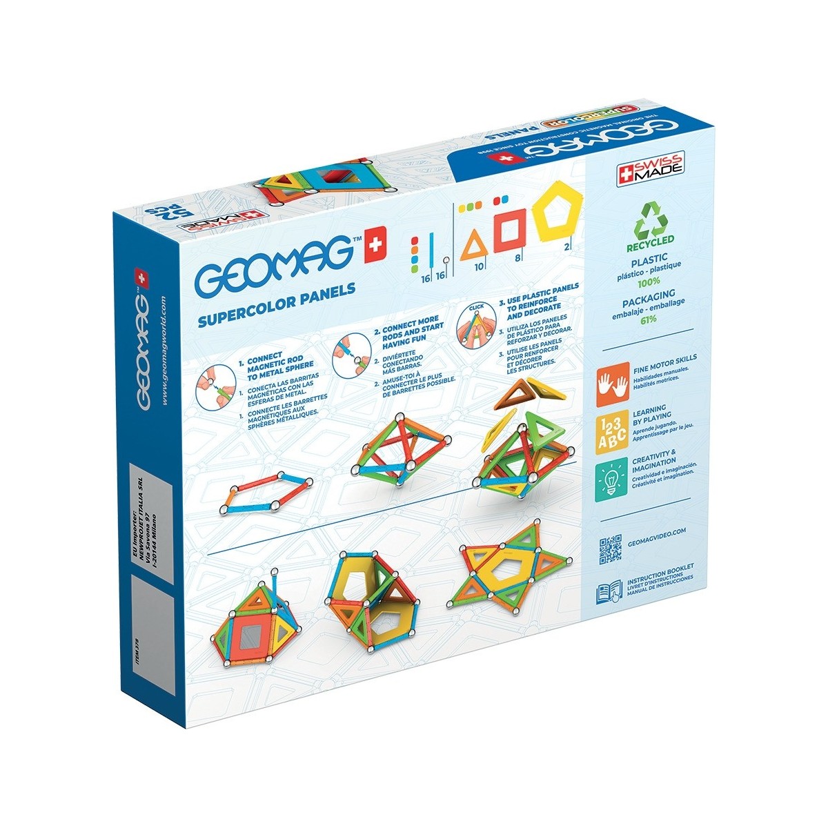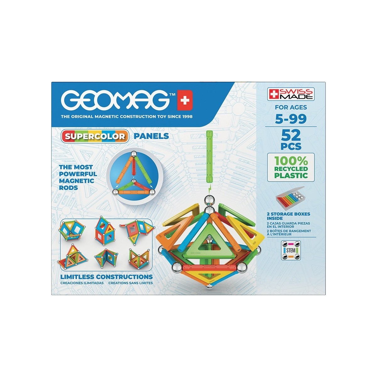 Geomag SuperColor Panels Recycled. Numero di pezzi: 52 pz, Colore del prodotto: Multicolore, Genere consigliato: Ragazzo/Ragazza, Età consigliata (min): 5 anno/i. Peso dell'imballo: 578,5 g