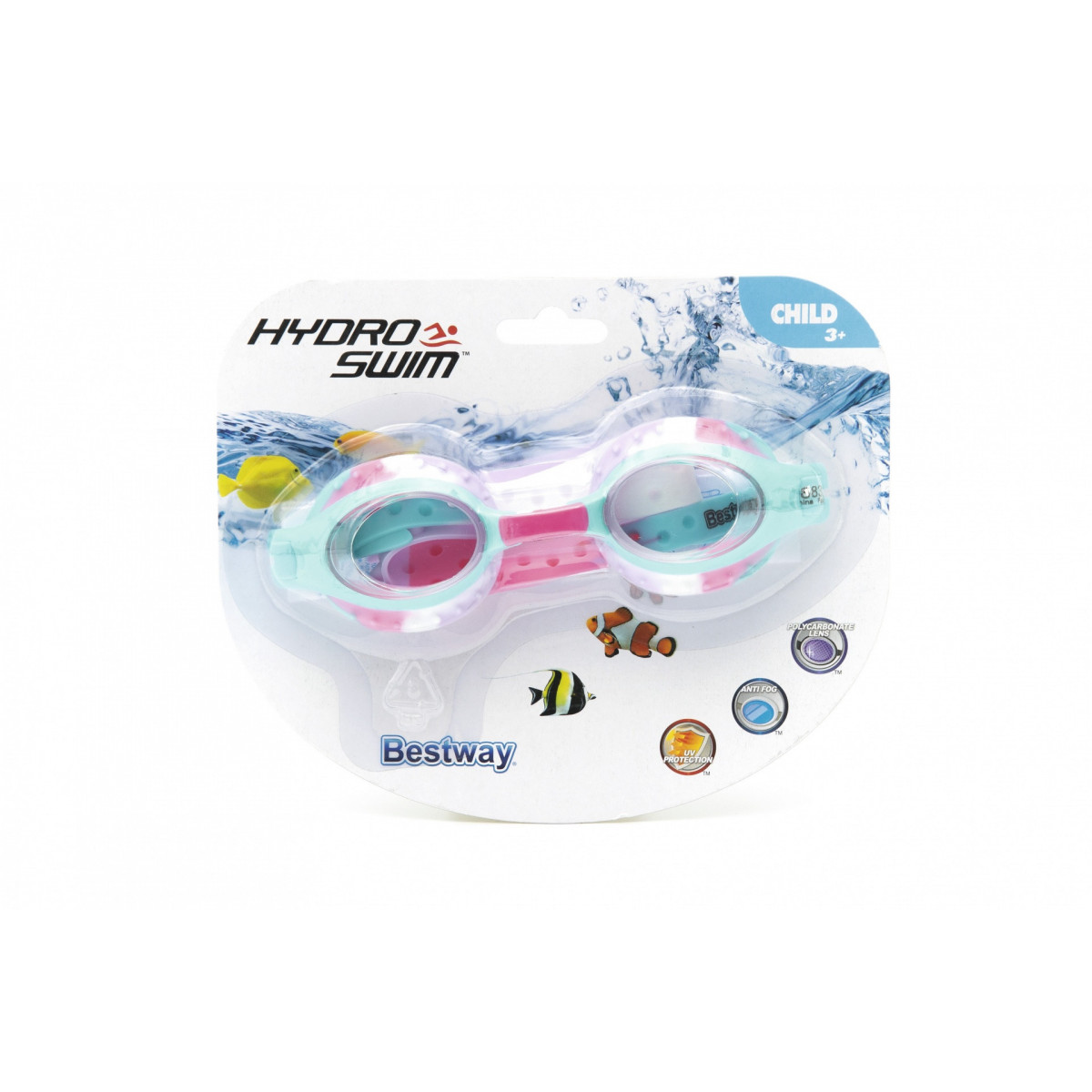 Bestway 21099. Adatto per: Unisex, Colore della montatura: Colori assortiti, Materiale del telaio: Silicone. Larghezza: 50 mm, Profondità: 250 mm, Altezza: 60 mm. Tipo di imballo: Cartoncino blister. Larghezza scatola principale: 19,5 cm, Lunghezza del cartone principale: 42 cm, Altezza scatola principale: 18 cm