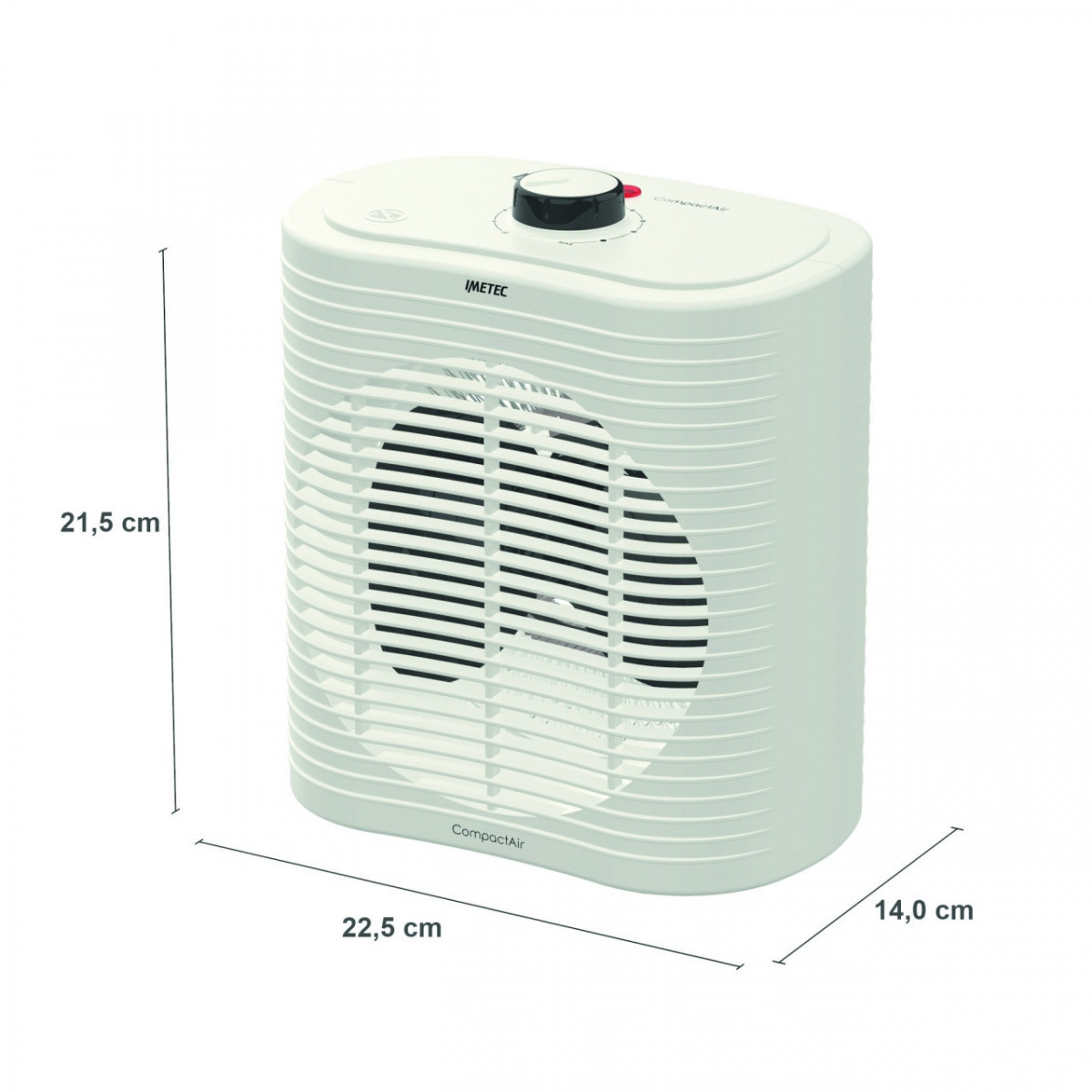 Imetec Compact Air. Tipo: Riscaldatore ambiente elettrico con ventilatore, Lunghezza cavo: 1,3 m. Adatto per: Interno, Opzioni di posizionamento: Pavimento, Tavolo, Colore del prodotto: Bianco. Potenza termica: 2000 W. Tensione di ingresso AC: 220 - 240 V, Frequenza di ingresso AC: 50 Hz. Larghezza: 140 mm, Profondità: 215 mm, Altezza: 225 mm