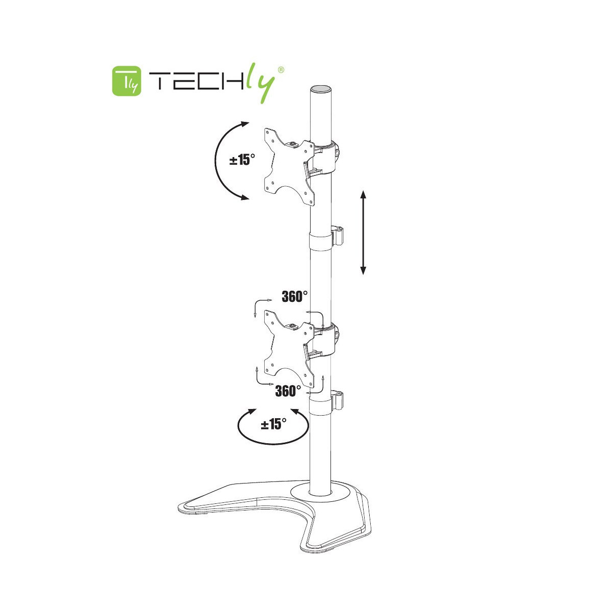 Techly Supporto da Scrivania per 2 Monitor 13-27" con base. Montaggio: Libera installazione, Peso massimo (capacità): 20 kg, Capienza minima dimensioni dello schermo: 33 cm (13"), Capienza massima dimensioni dello schermo: 68,6 cm (27"), Compatibilità interfaccia di montaggio (min): 75 x 75 mm, Compatibilità interfaccia di montaggio (max): 100 x 100 mm. Angolo di rotazione: -15 - 15°, Inclinazione: -15 - 15°. Colore del prodotto: Nero