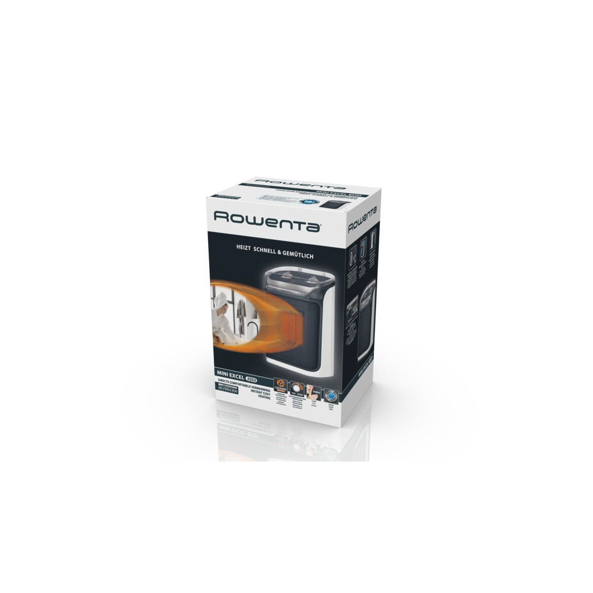 Rowenta Mini Excel Aqua SO9281F0. Tipo: Riscaldatore ambiente elettrico con ventilatore, Tipologia elemento riscaldante: Ceramica, Paese di origine: Cina. Adatto per: Interno, Opzioni di posizionamento: Scrivania, Pavimento, Tavolo, Colore del prodotto: Bianco. Potenza termica: 2000 W, Potenza termica (min): 1000 W, Livello di rumore della ventola (min): 50 dB. Potenza: 2000 W, Tensione di ingresso AC: 220 - 240 V, Frequenza di ingresso AC: 50 Hz. Larghezza: 146 mm, Altezza: 308 mm, Peso: 1,82 kg