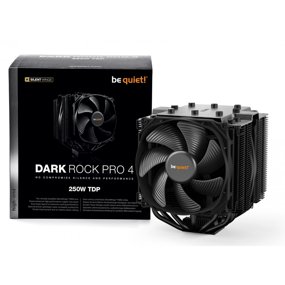 be quiet! Dark Rock Pro 4. Tipo: Refrigeratore, Diametro del ventilatore: 120/135 mm, Velocità (massima) di rotazione: 1500 Giri/min, Rumorosità (velocità bassa): 12,8 dB, Rumorosità (velocità alta): 24,3 dB, Tipo di cuscinetto: Fluid Dynamic Bearing (FDB). Larghezza: 136 mm, Profondità: 162,8 mm, Altezza: 123,7 mm. Colore del prodotto: Nero