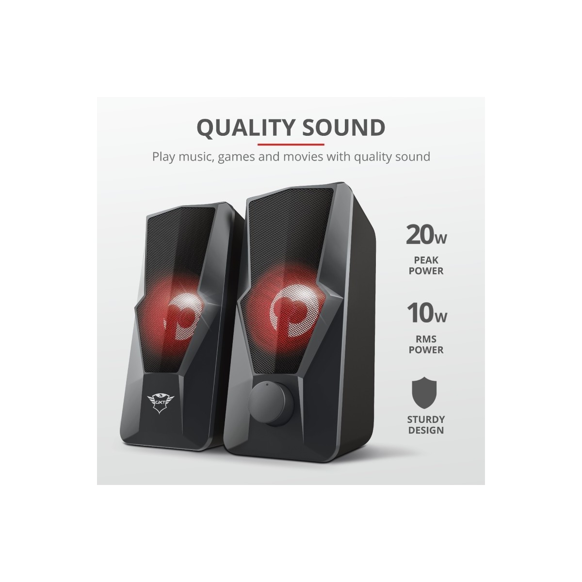 Con una potenza massima di 20W, gli altoparlanti producono una gamma ricca di suoni dei giochi, video e brani musicali. Nonostante il formato compatto, il set produce suoni potenti.